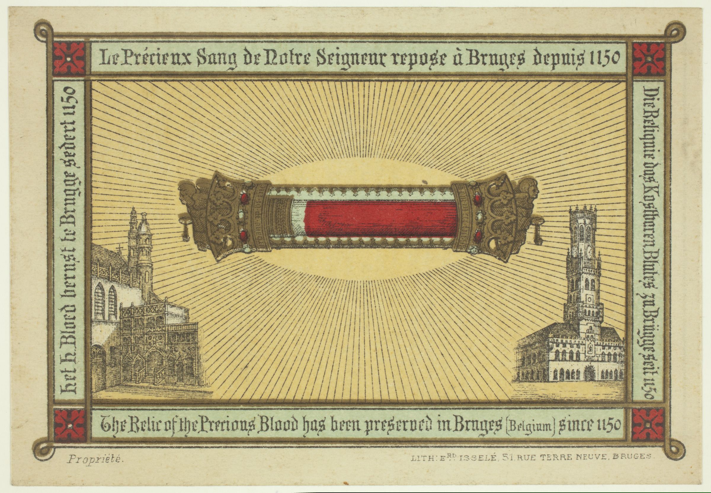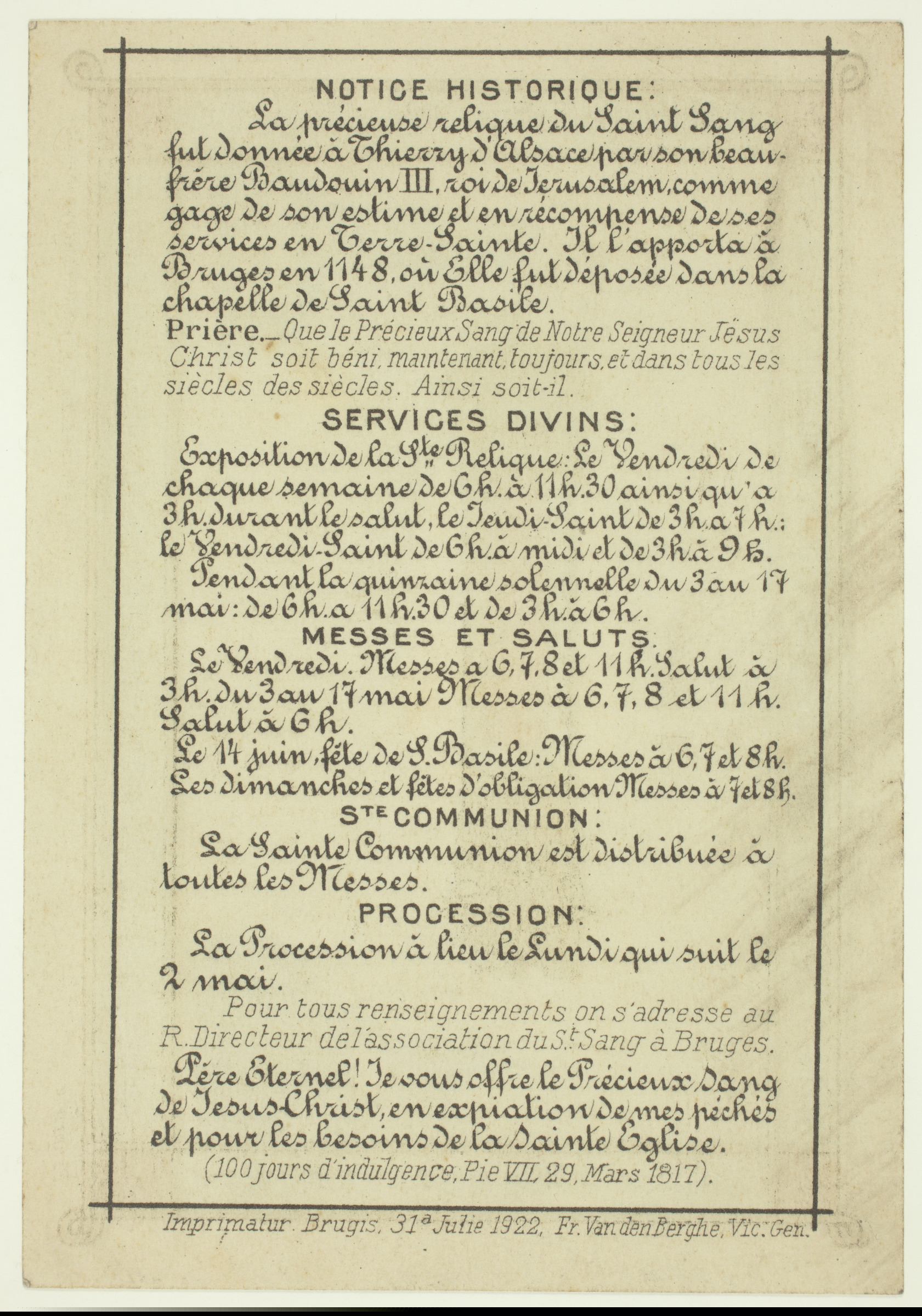 | Irudi erlijiosoa: Jesukristoren odolaren erlikia eta Brujaseko eraikuntzak | Le Précieux Sang de Notre Seigneur repose à Bruges depuis 1150 = Die Reliquie [...], Propiété, Lithierd. Isselé, 51 Rue Terre Neuve, Bruges [imp. r.]; Notice Historique: La précieuse relique du Saint Sang fut donnée à Thierry d'Alsace par son beau-frère Baudouin II, roi de Jerusalem, comme gage de son estime et en récompense de ses services en Terre Sainte. Il l'apporta à Bruges en 1148, où Elle fut déposée dans la chapelle de Saint Basile. Prière: [...]. Services Divins: [...]. Messes et saluts: [...]. Ste Communion: [...]. Procession: [...]. Pour tous renseignements on s'adresse au R. Directeur de l'association du St. Sang à Bruges. [...]. Imprimatur Brugis. 31ª Julie 1922, Fr. Van den Berghe, Vic. gen. [imp. v.] |