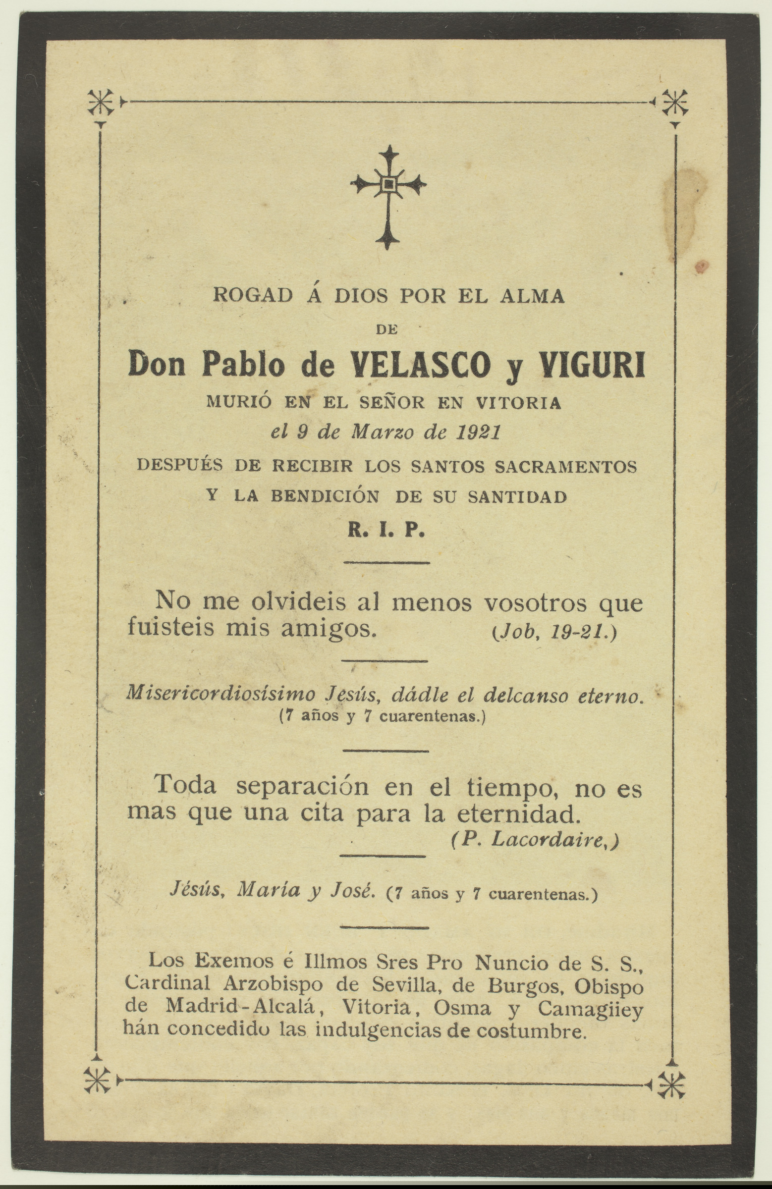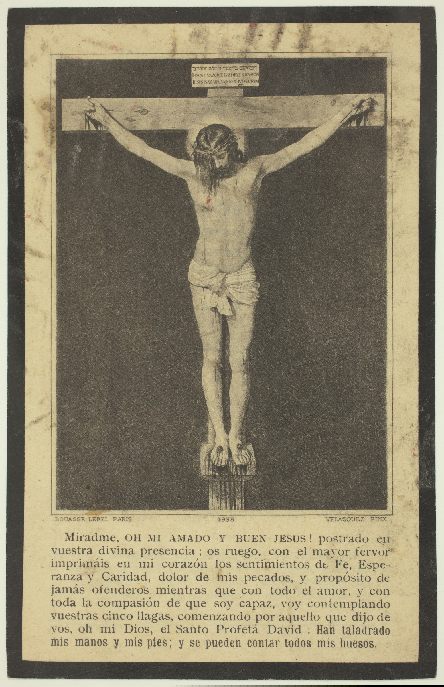 | Irudi erlijiosoa: Jesukristo gurutzean | Bouasse-Lebel. - Paris, 4938, Velasquez pinx. Miradme, Oh mi amado y Buen Jesus! postrado en vuestra divina presencia[...] [imp. r.]; Rogad a Dios por el alma de Don Pablo de Velasco y Viguri, murió en el Señor en Vitoria el 9 de marzo de 1921 después de recibir los santos sacramentos y la bendición de su santidad [...] [imp. v.] |