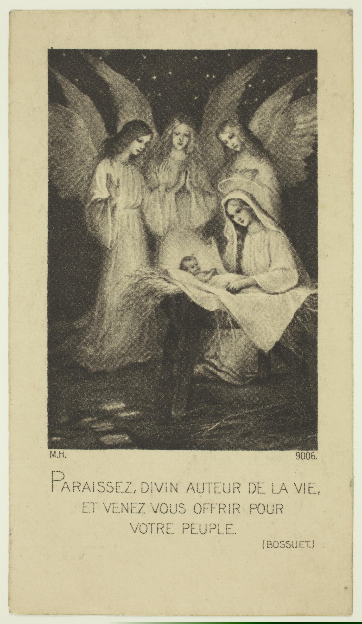 | Irudi erlijiosoa: Jesusen jaiotza | M.H., 9006. Paraissez, divin auteur de la vie, et venez vous offrir pour votre peuple (Bossuet.) [imp. r.]; El niño Fernando Sancho de Ybarra subió a la gloria en Sigüenza el 29 de Julio de 1931 a los tres años nueve meses D.E.P. [...], Tip. Box [imp. v.] |
