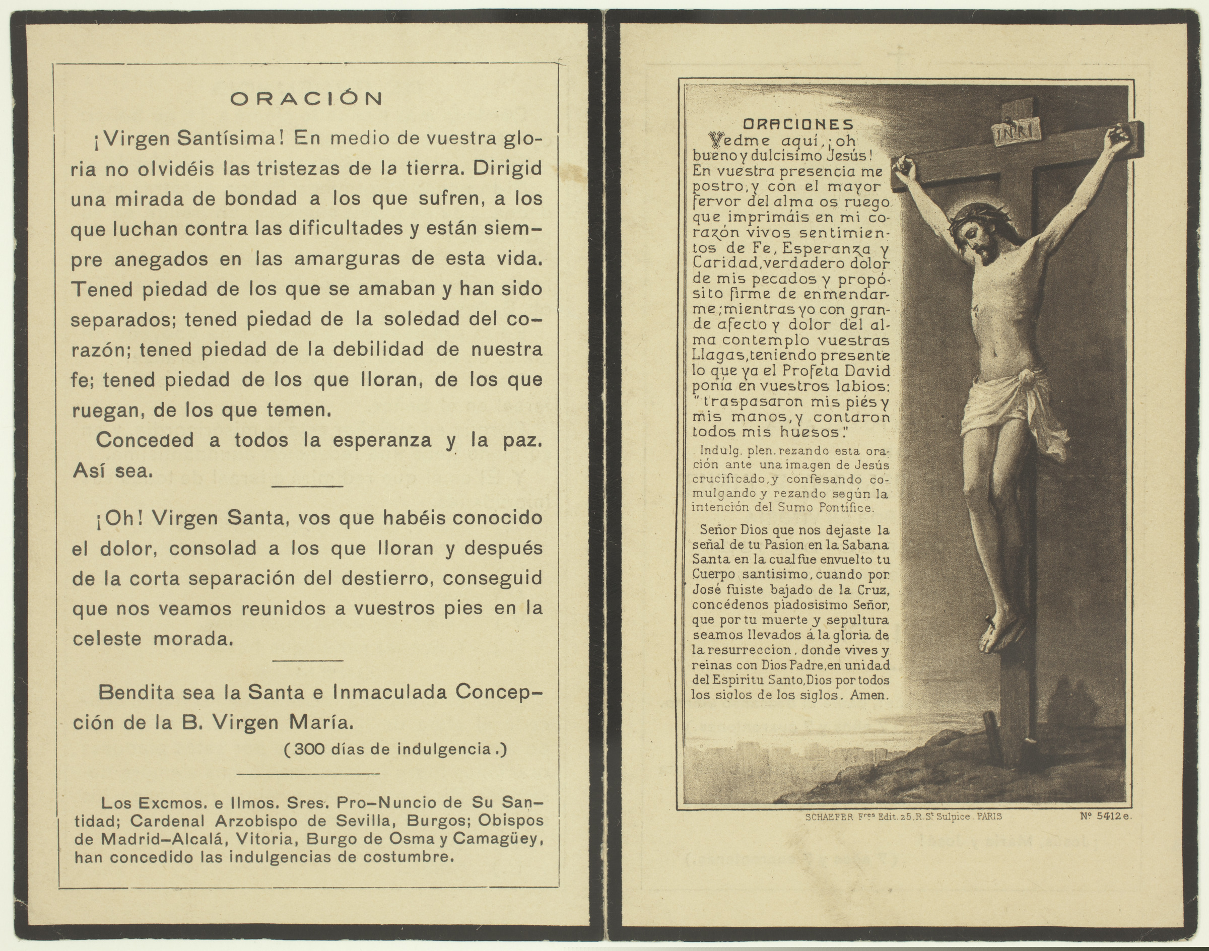 | Irudi erlijiosoa: Kristo gurutzean / gizon erretratua | Oraciones. Vedme aquí, ¡oh bueno y dulcísimo Jesús! En vuestra presencia me postro [...] Schaefer Fres. Edit. 25, R. St. Sulpice. Paris. Nº 5412 e [imp. r.]; Rogad a Dios por el alma de Don Pablo de Velasco y Viguri. Murió en el Señor en Vitoria el 9 de Marzo de 1921 después de recibir los santos sacramentos y la bendición de su santidad. R.I.P. [...] [imp. v., p. 2-4] |