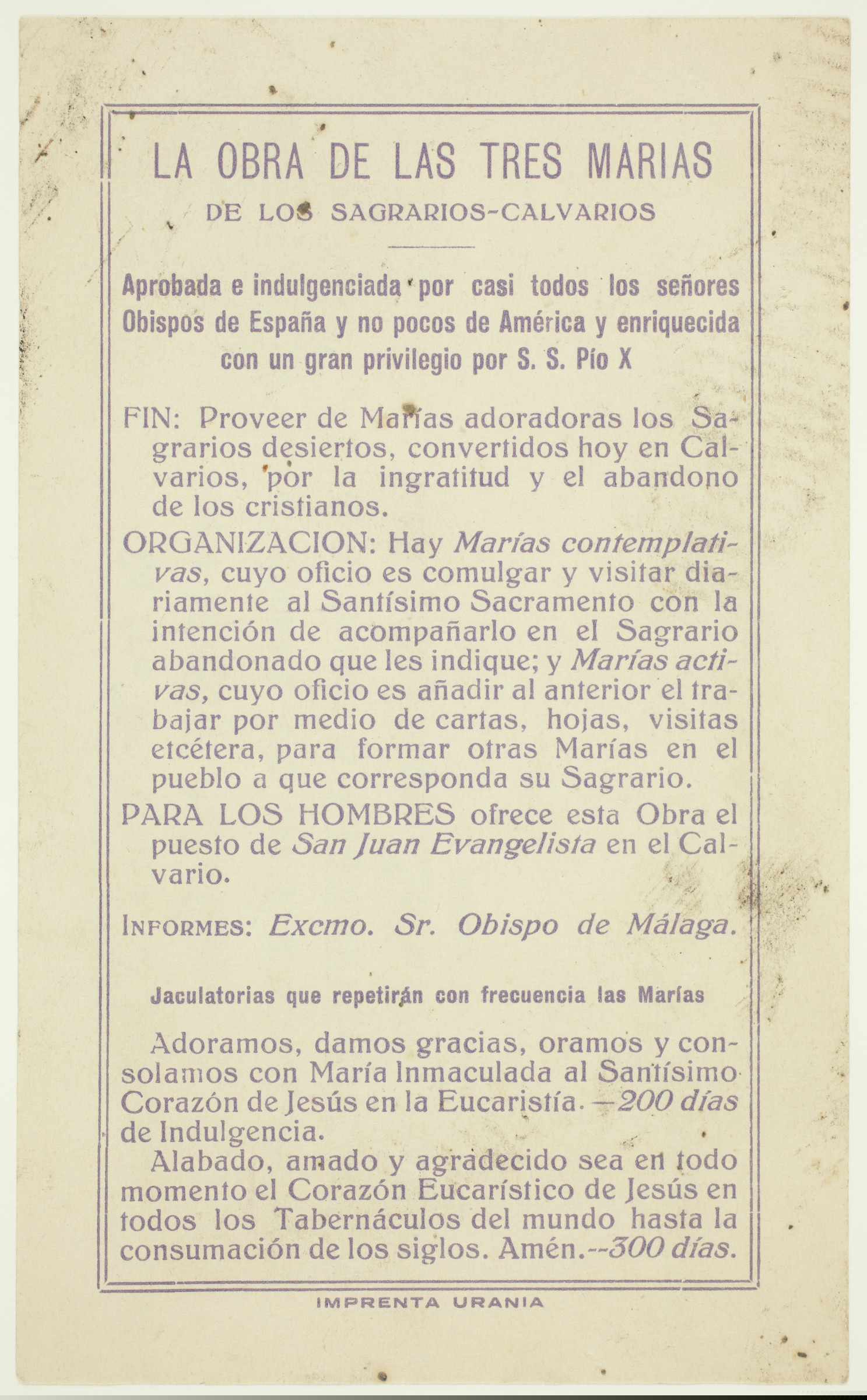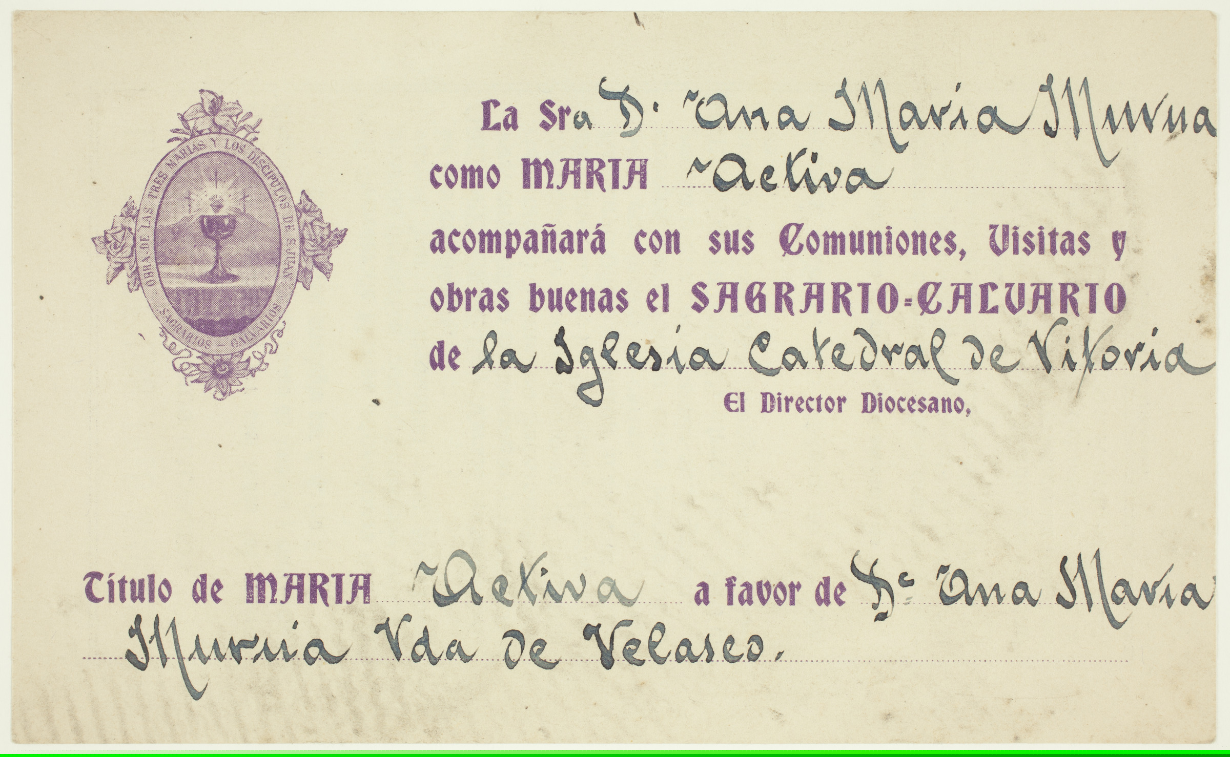 | Ana Maria de Muruari emandako Maria titulua | La Sra D. Ana María Murua como Maria activa acompañará con sus Comuniones, Visitas y obras buenas el Sagrado Calvario de la iglesia Catedral de Vitoria. El Director Diocesano, [sinadura falta da]. Título de María activa a favor de Dª Ana María Múrua Vda. de Velasco [imp. r.]; La obra de las tres Marías de los Sagrarios-Calvarios. Aprobada e ndulgenciada por casi todos los señores Obispos de España y no pocos de América y enriquecida con un gran privilegio por S.S. Pio X. Fin: Proveer de marías adoradoras los Sagrarios desiertos, convertidos hoy en Calvarios, por la ingratitud y el abandono de los cristianos. Organización: Hay Marías contemplativas , cuyo oficio es comulgar y visitar diariamente al Santísimo Sacramento con la intención de acompañarlo en el Sagrario abandonado que les indique; y Marías activas, cuyo oficio es añadir al anterior el trabajar por medio de cartas, hojas, visitas etcétera, para formar otras Marías en el pueblo a que corresponda su Sagrario. Para los hombres ofrece esta obra el puesto de San Juan Evangelista en el Calvario. Informes: Excmo. Sr. Obispo de Málaga. [...] Imprenta Urania [imp. v.] |