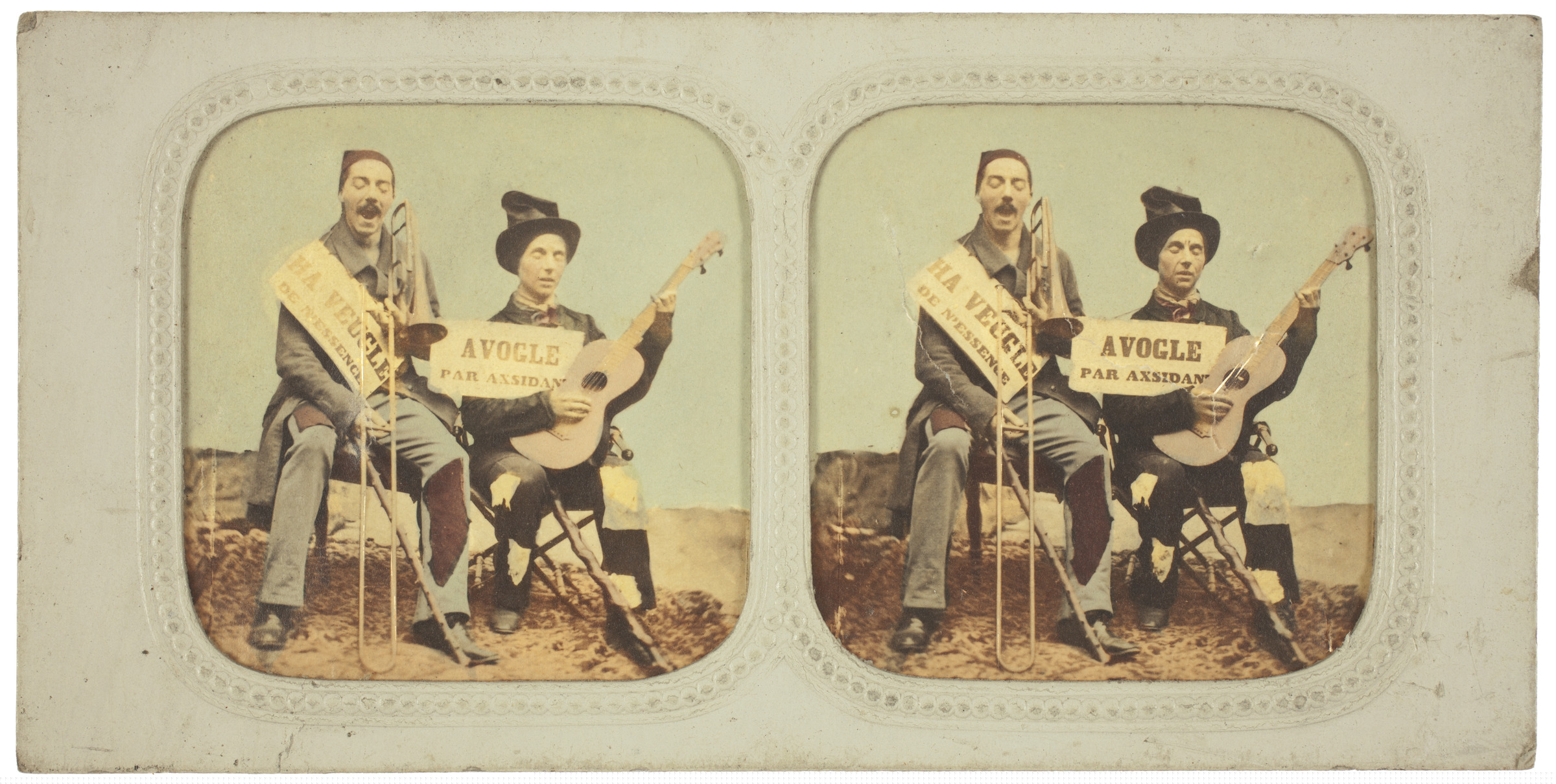 | Bi gizon itxuren erretratua musika jotzen: bata tronboia jotzen eta "Ha veugle de n'essence" dioen kartela lepotik zintzilik duela, bestea gitarra jotzen eta "Avogle par axsidant" dioen kartela lepotik zintzilik. |
