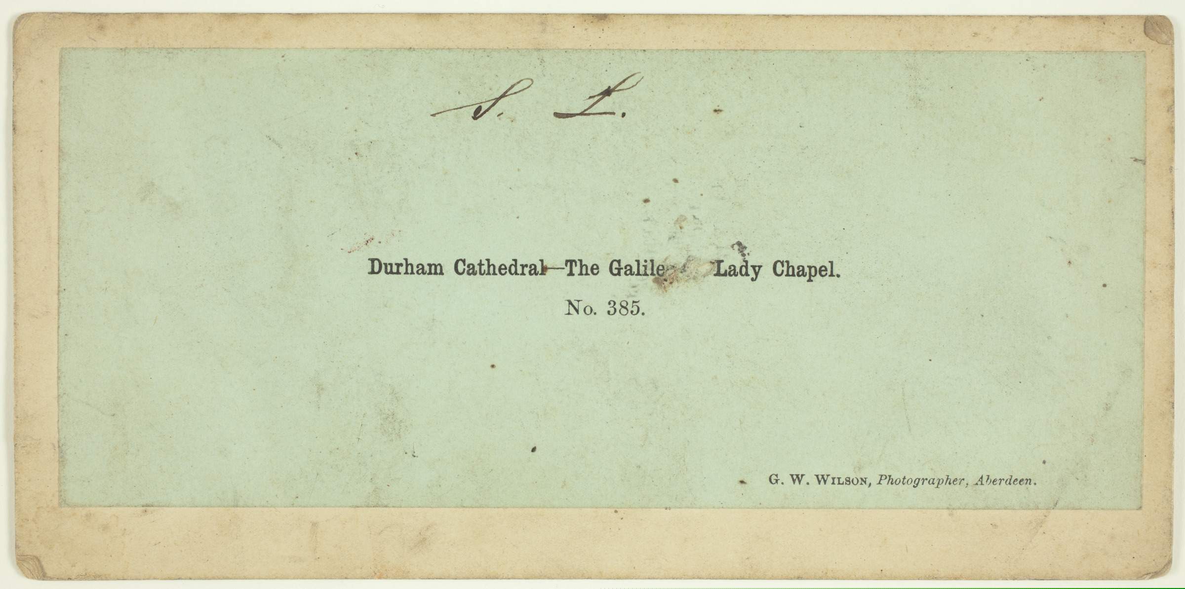 | Elizaren barrukaldea | S.L. [ms. v.]; Durham Catedral, The Galile[...] Lady Chapel. Nº 385. G.W. Wilson, Photographer, Aberdeen [imp. v.] |