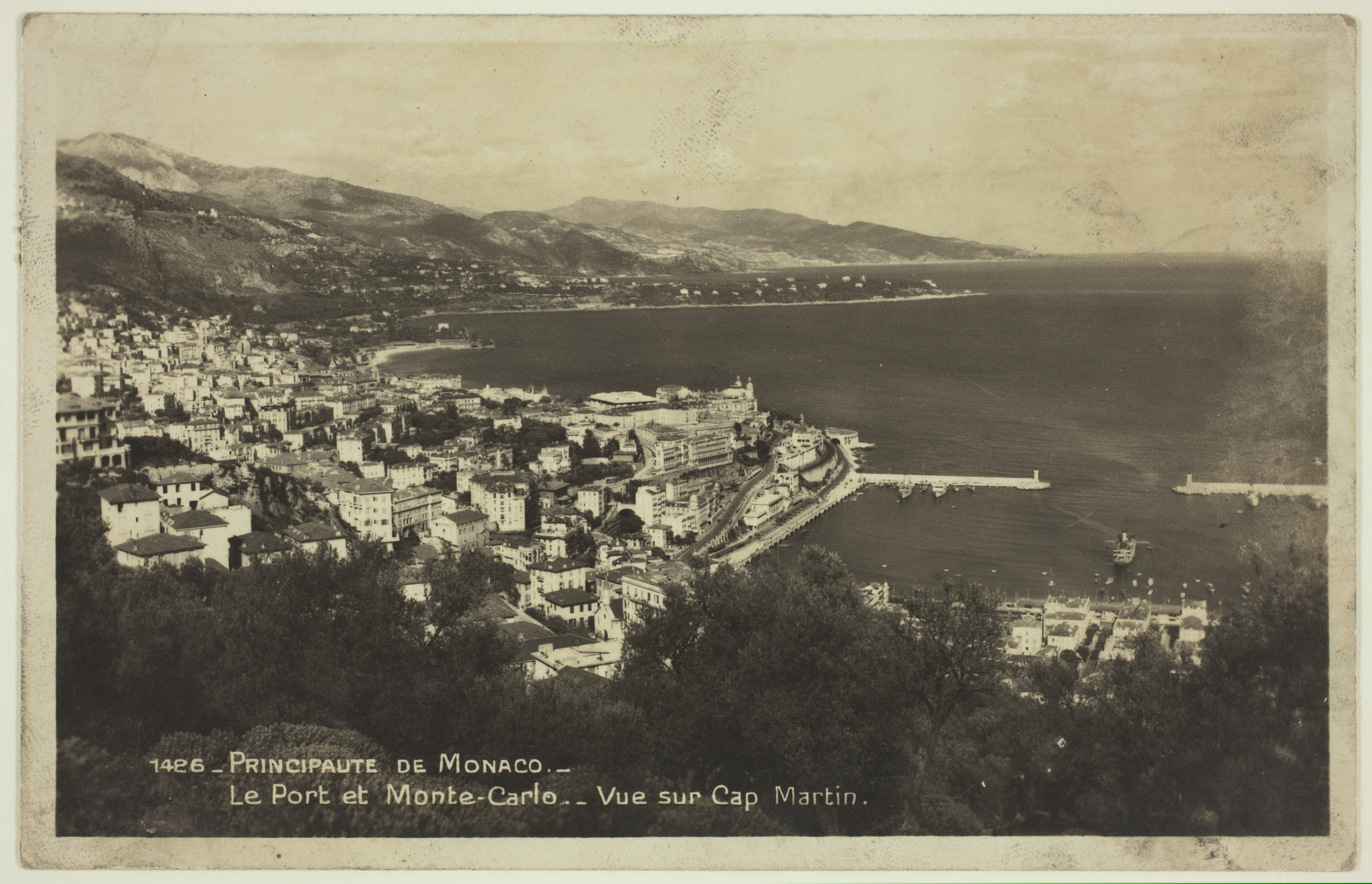 | Monacoko vista | 1426 - Principauté de Monaco. Le port et Monte-Carlo. - Vue sur Cap Martin [imp. r.]; Montecarlo - 7-X-35, Desde este precioso pasi, y con todo afecto van estos renglones. Hacemos el viage sin novedad, y esta parte de Francia y Mónaco son preciosos. Esta noche voy a probar suerte en el famoso casino, ya os contaré lo que me ocurra. He encontrado mucha gente conocida, pero estoy deseando volver a veros y os contaré detalles graciosos y curiosos. Hasta pronto, queda vuestro muy affmo. sobrino [sinadura:] Luis. Espagne. Excmos. Srs. Condel del Valle, San Ana. Vergara (Guipúzcoa) [ms. v.] |