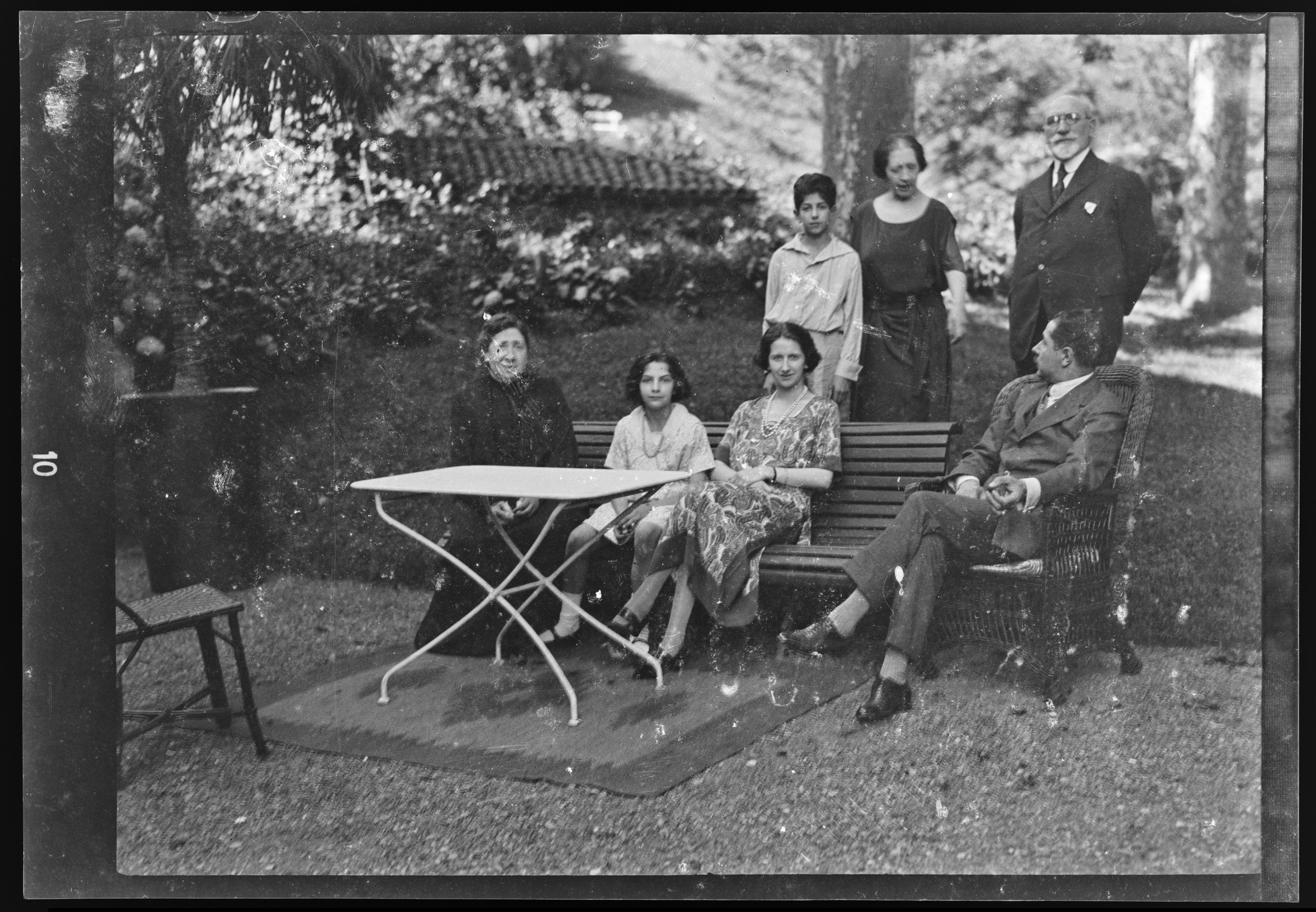 Taldea lorategian: hiru emakume, bi gizon, neskatila eta mutikoa |