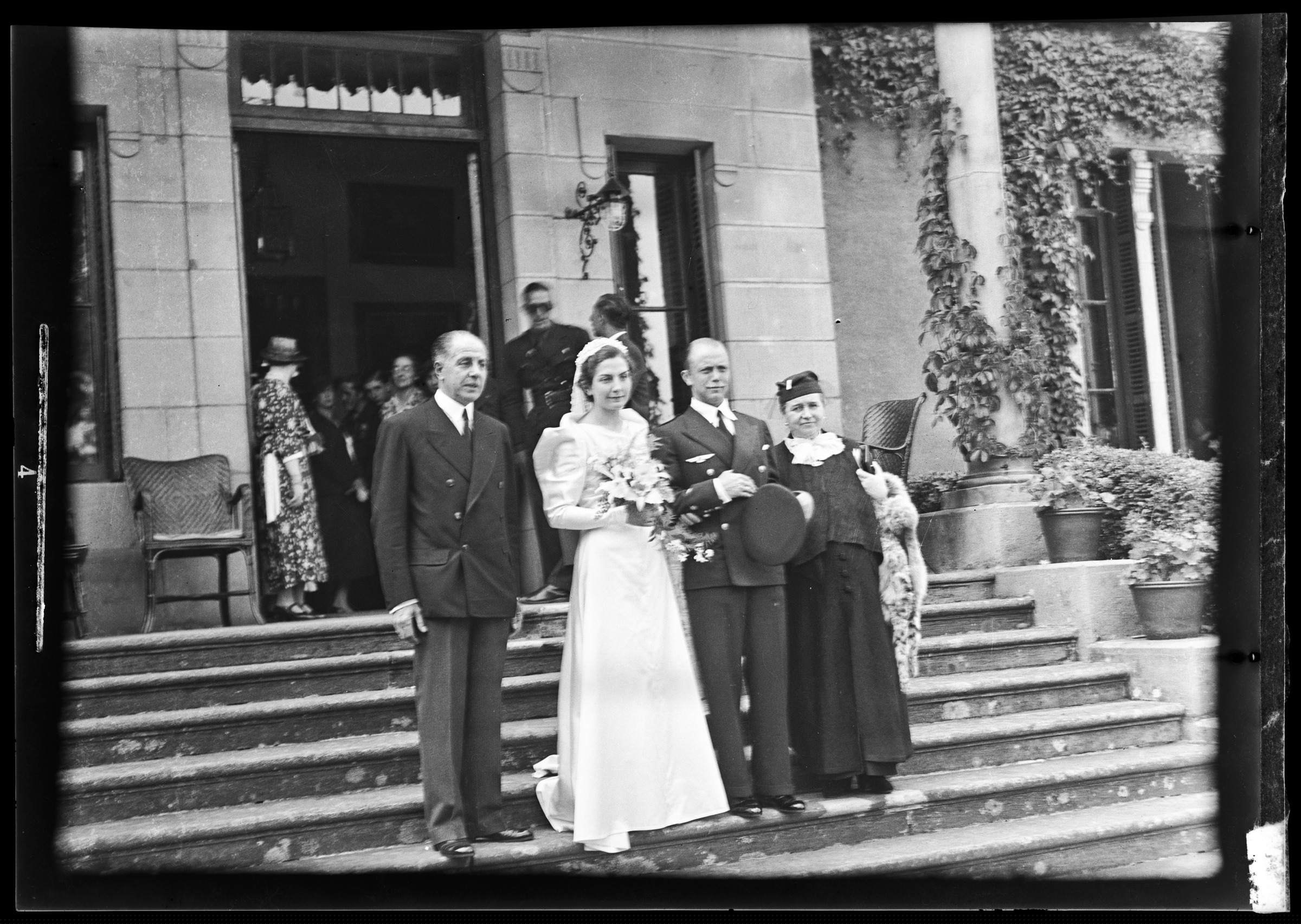 | Ezkonberriak beste bikote batekin eskaileretan; bigarren planoan jende gehiago ikusten da |
