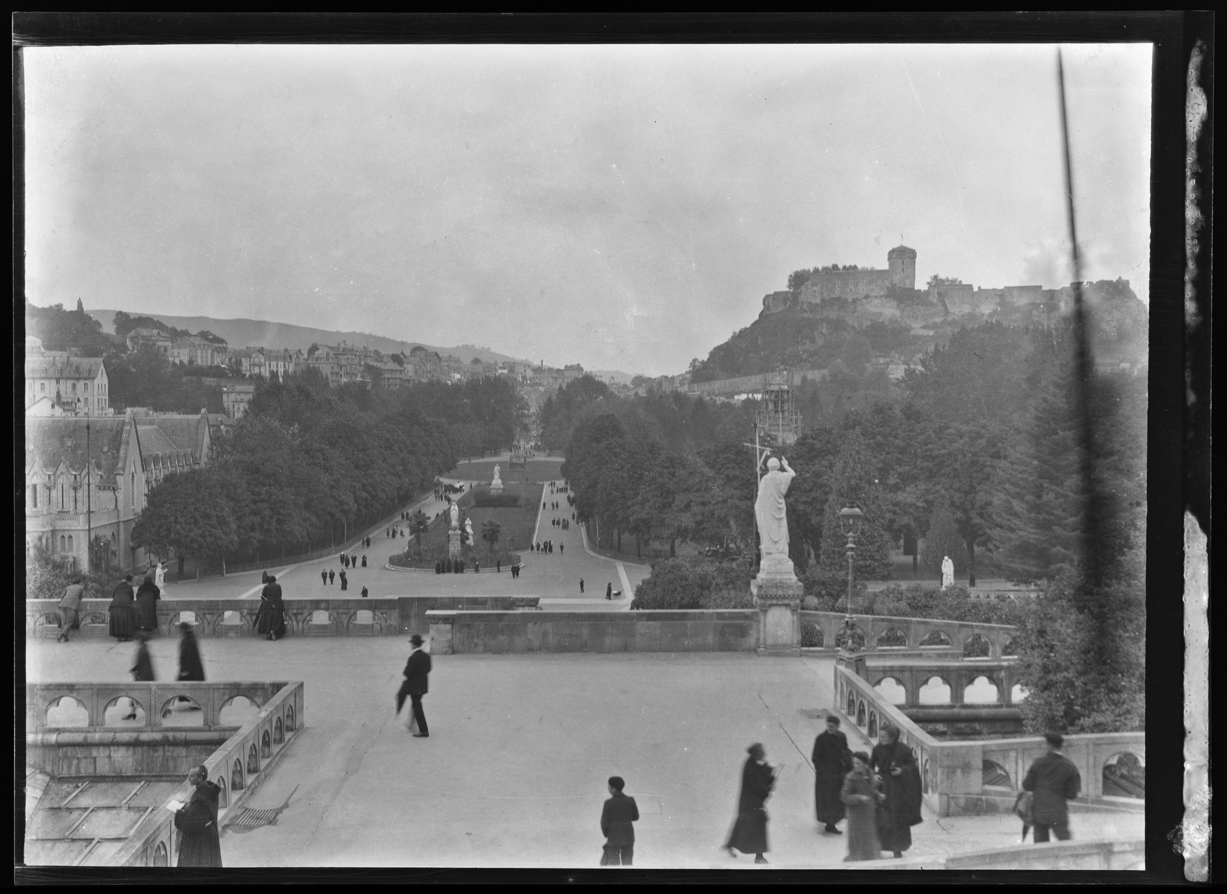 Lehenengo planoan jendea Lourdeseko Santutegiko terrazan , atzekaldean basilikara doan bide zabala. Ezkerraldean, gaztelua ikus daiteke. |