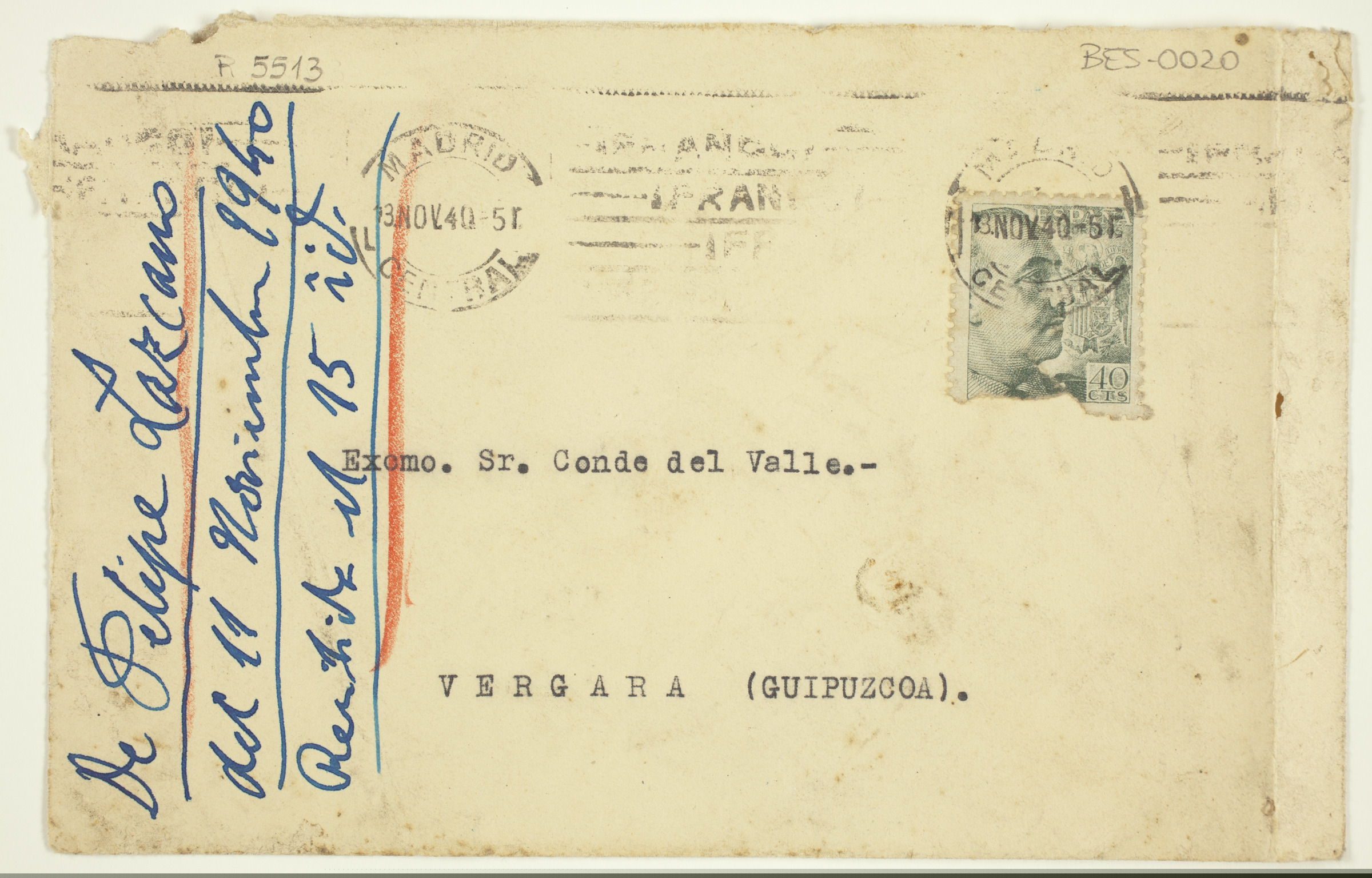 | Kartazala | De Felipe Lazcano del 11 Noviembre 1940. Recibida el 15 id. [ms. r.]; Excmo. Sr. Conde del Valle. - Vergara (Guipúzcoa) [mec. r.] |