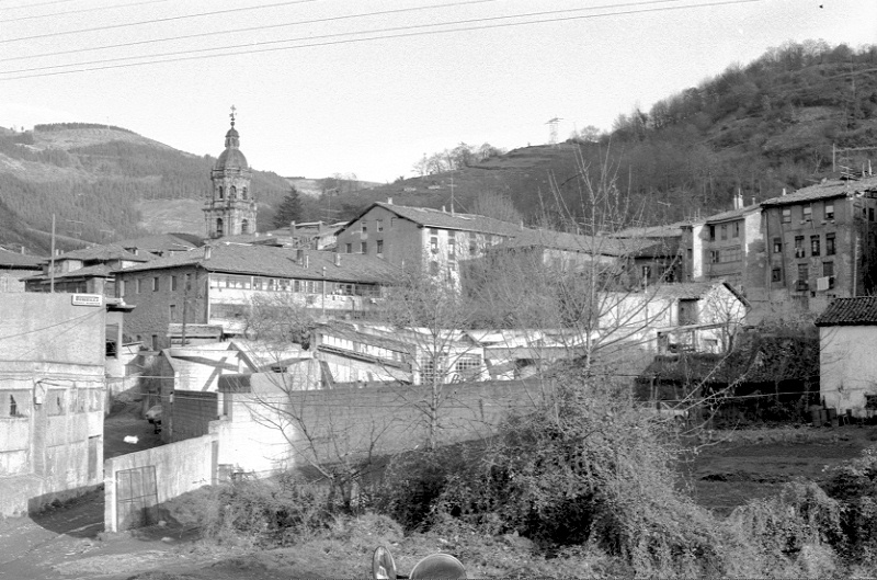 Bergarako bista Osteetatik: lehenengo planoan tailerrak, atzerago Bidekurutzeta kaleko etxeen atzekaldea, azkenengo planoan San Pedro elizaren dorrea |