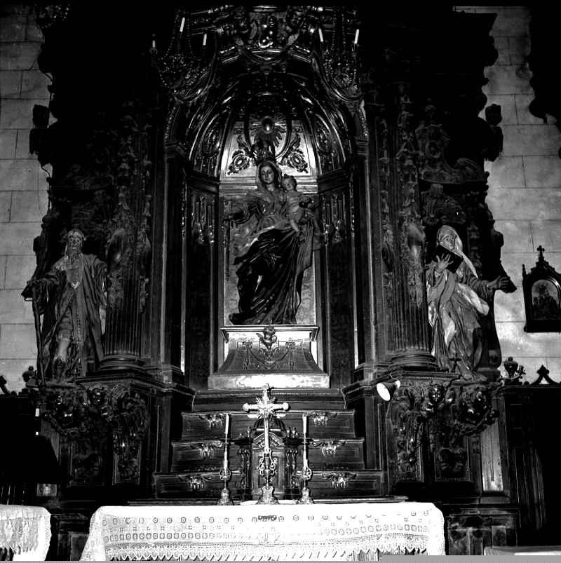 | Errosarioko Andra Mariaren imajina, Santa Marina elizan (1968ko konponketa egin aurretik); alboetan San Joaquin eta Santa Anaren imajinak ikusten dira |