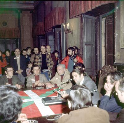 | Ikurriñaren legalizazioaren plenoa: alkatea eta zinegotziak ikurriñaz estalitako mahaiaren inguruan |