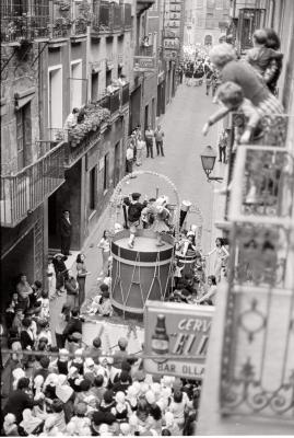 | Umeen Euskal Jaiaren desfilea Barrenkaletik: neska-mutikoa dantzan danbolin haundi baten gainean |