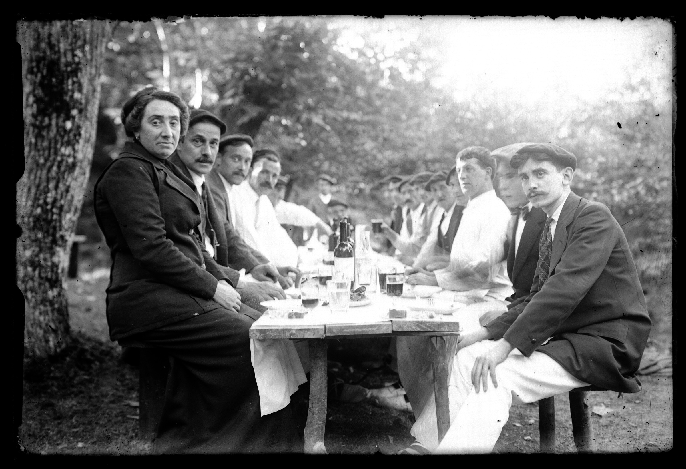 | Taldea bazkaltzen San Martzialeko kanpan | Recuerdo de San Martzial, 1912. Agrupa personas distinguidas, casi todas [ms. plaka gordeta zegoen sobrean] |