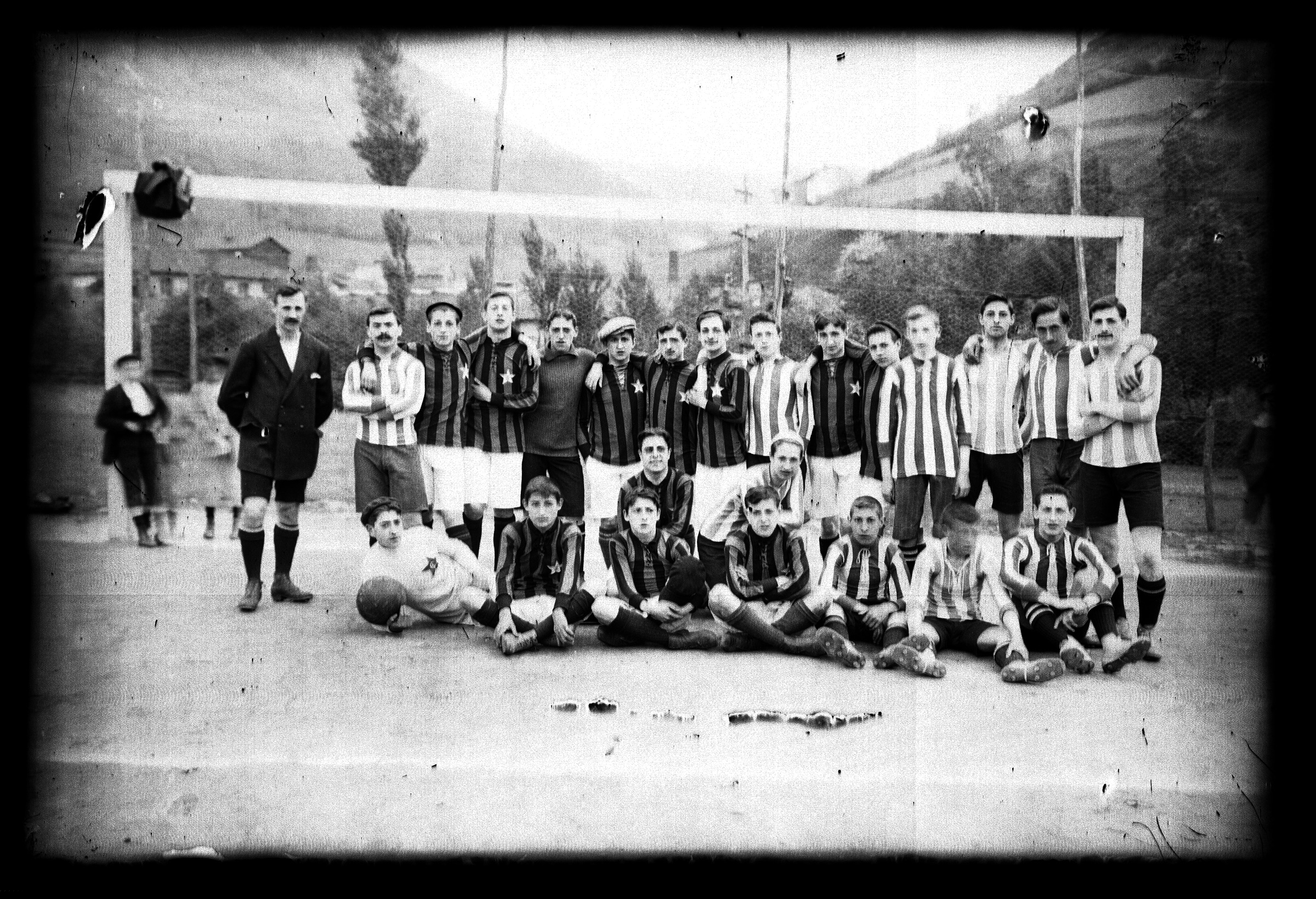 | Futbolari taldea | Aurrera de Bergara e Izarra de Eibar, contendientes en un partido en Torrekua, año 1920 [ms. plaka gordeta zegoen sobrean] |