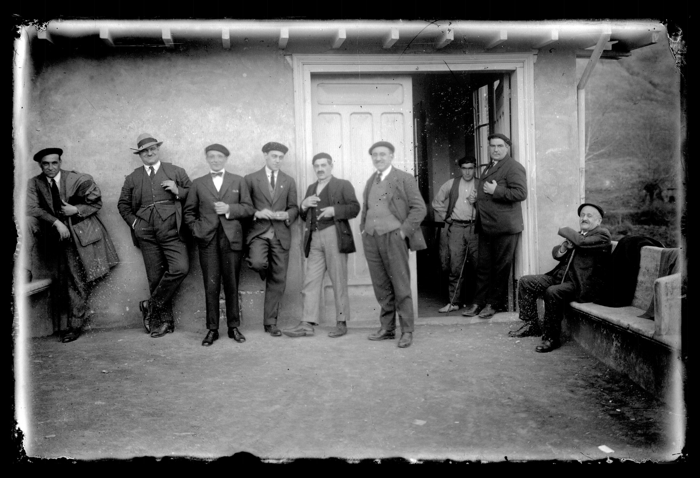 | Gizon taldea (9 pertsona) etxe baten aurrean | Recuerdo de Egino, año 1916. Personajes muy conocidos y distinguidos de la villa: Idarreta, Etxaniz, D. Pantaleón, Zabala, Mendibil, Narbaiza, etc. [ms. plaka gordeta zegoen sobrean] |
