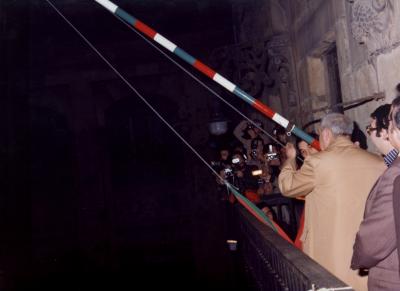 Antonio Irazola zinegotzia Udaletxeko balkoian iIkurriña jartzen |