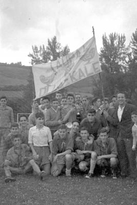 | Futbol txapelketaren talde irabazlea pankartarekin |