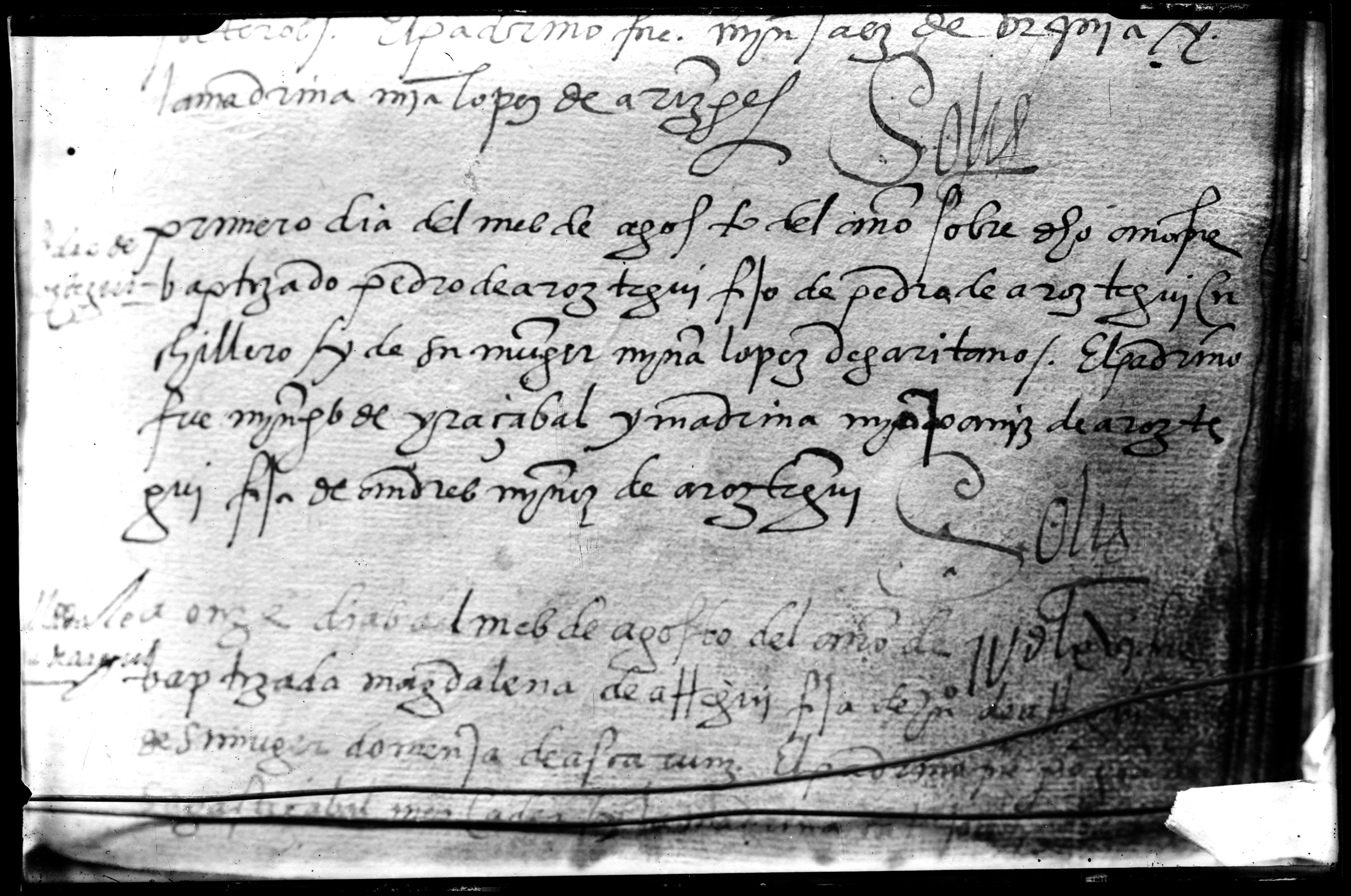 Pedro de Arostegui-ren bataio agiria (San Pedro elizaren lehenengo bataioen liburua, 1547-1589, fol. 86) |
