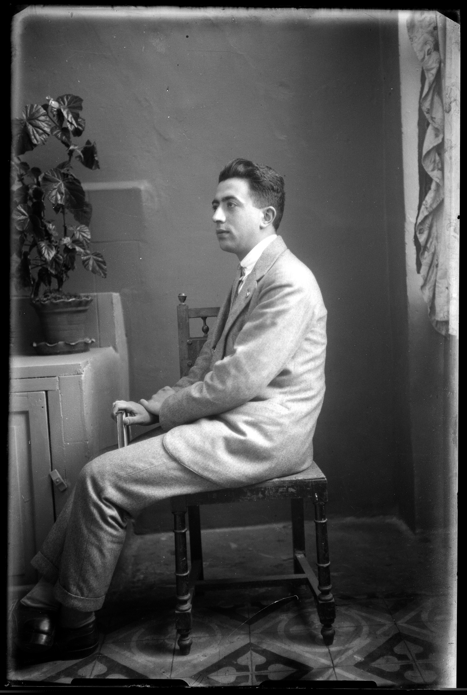 | Gizon erretratua ezkerraldera begira aulki batean jarrita |