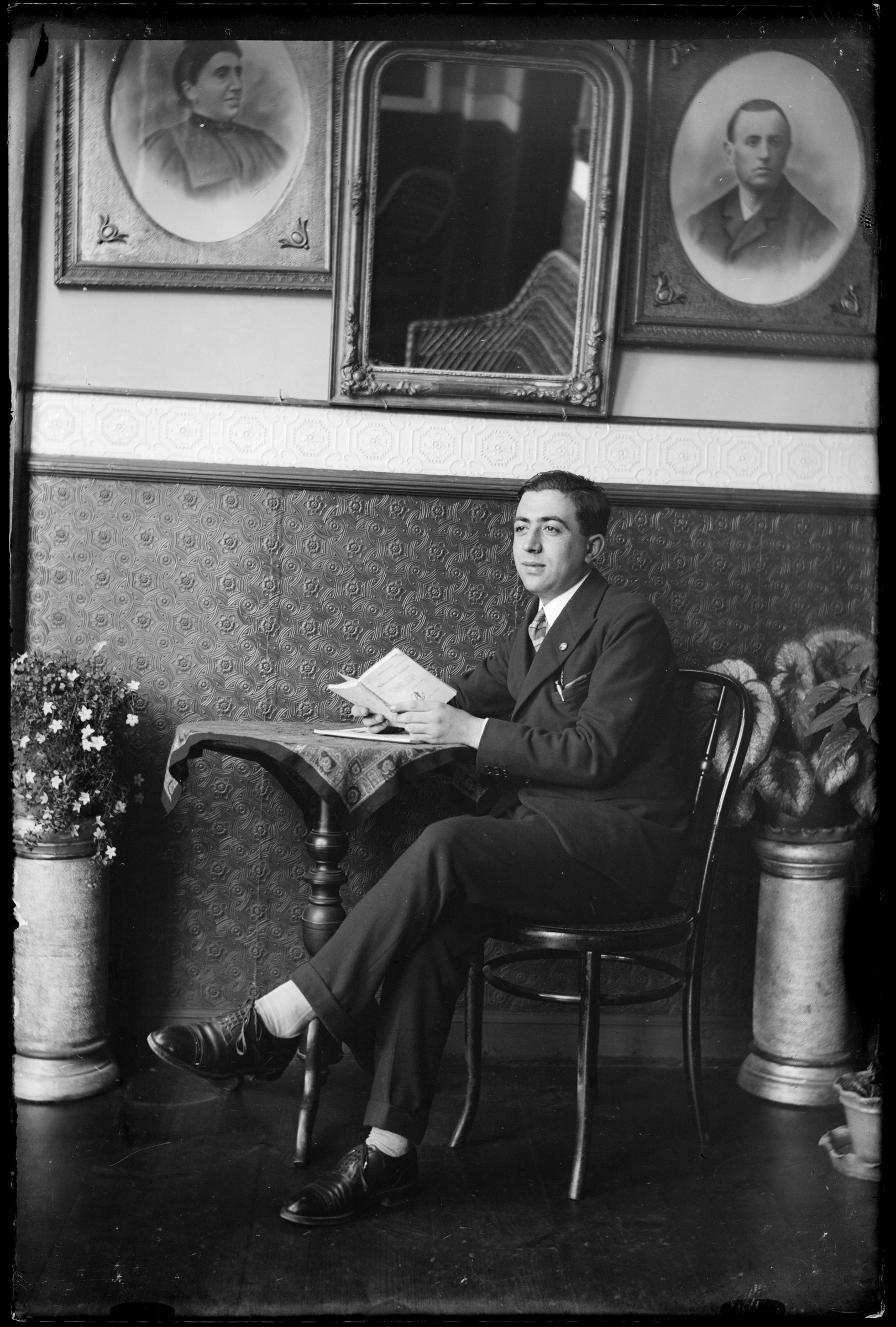 Gizon erretratua mahaitxo baten ondoan jarrita, eskuarten liburu bat duela; paretan agertzen diren erretratuak Juliana Aranaren gurasoarenak dira. |