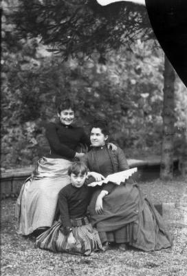 | Bi emakume eta neskatila lorategian |