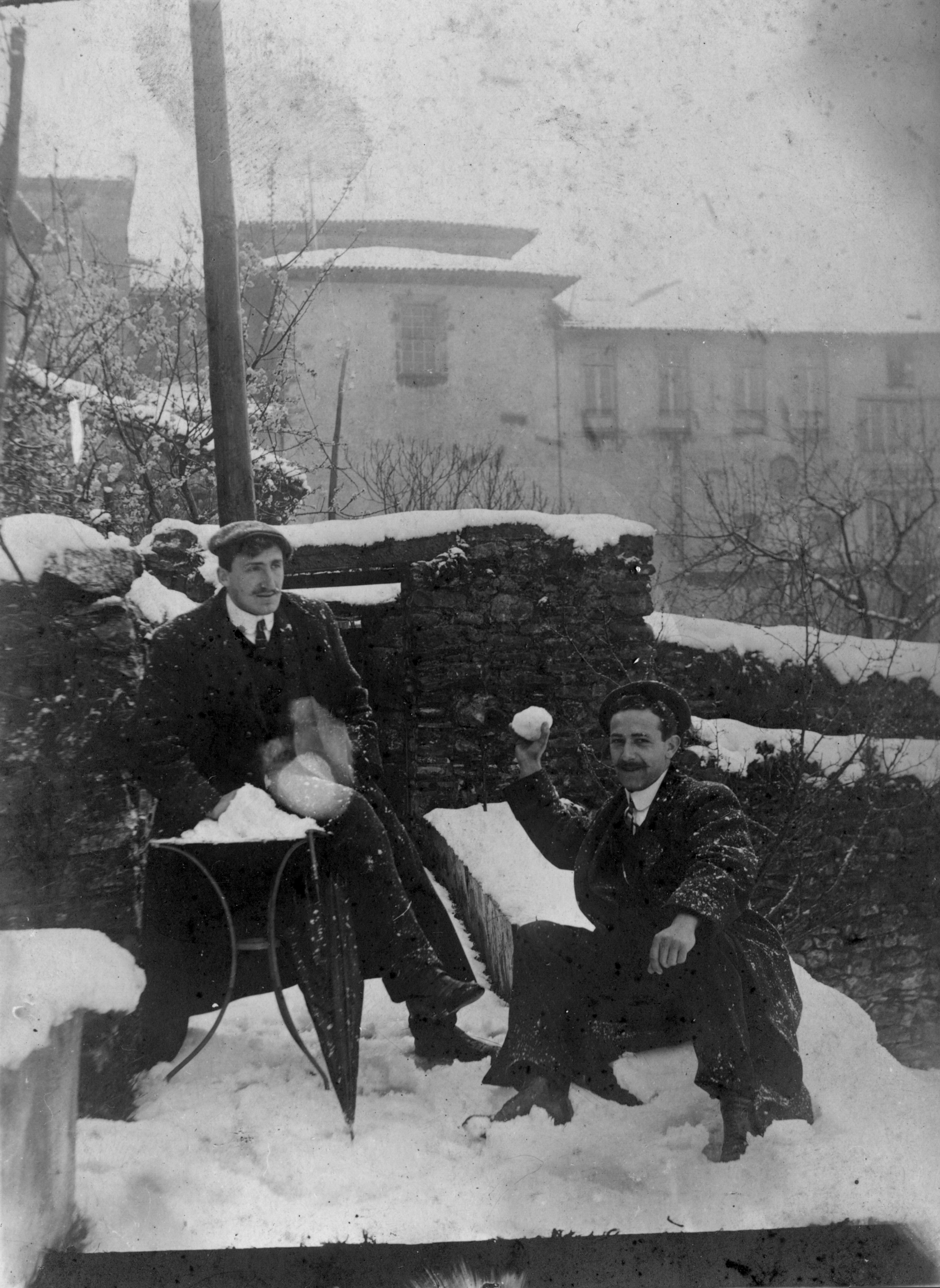 | Bi gizon elurrarekin jolasean: bigarren planoan Seminarioaren oraingo Irala kaleko fatxada ikusten da |