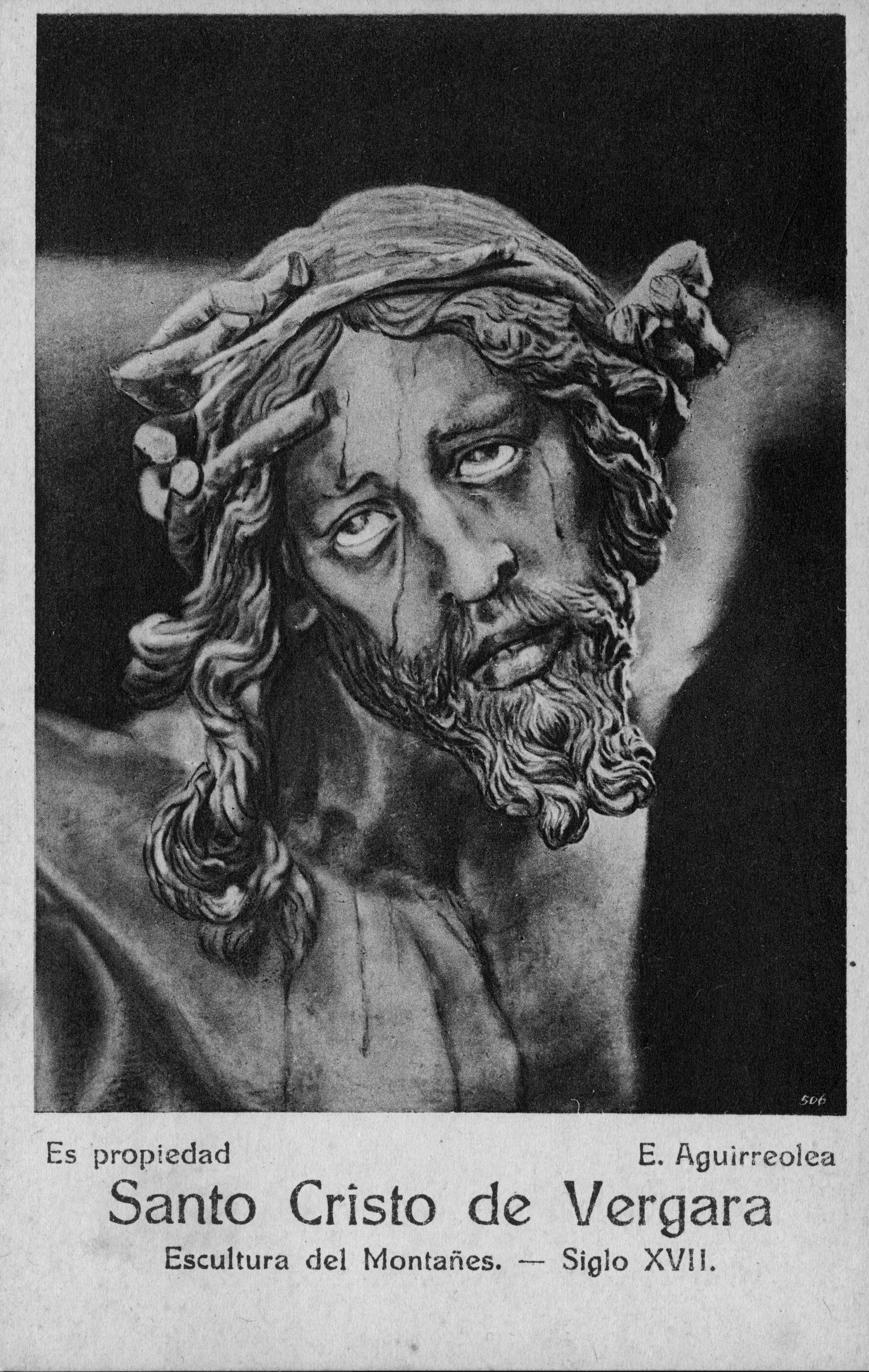 | Kristo Santuaren irudiaren xehetasuna (aurpegia) | Es propiedad E. Aguirreolea. Santo Cristo de Vergara, escultura del Montañés, siglo XVII [imp.r.] |