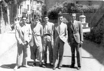| Gazteen taldea Bidekurutzeta kalearen sarreran; bigarren planoan, oraingo Erregetxo plazan zegoen iturria |