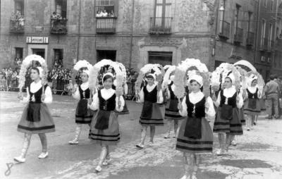Dantzariz jantzitako nesken desfilea San Martin Agirre plazara sartzen, paperez apaindutako arkuak daramate | 8 [ms.r./v.] |