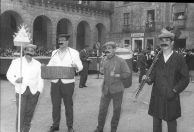 Piruli saltzaile, goxoki saltzaile, barkillero eta argazkilari jantzitako lau gizon San Martin Agirre plazan | 28 [ms.v.] |