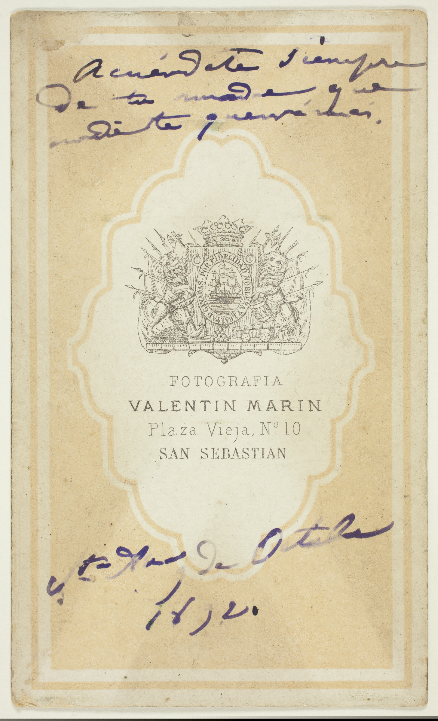 | Emakume erretratua | Valentin Marin, Foto. [imp. r.]; Acuérdate siempre de tu madre que nadie te querrá más. Sta. Ana, 9 de Octubre de 1892 [ms.v.]; Fotografía Valentín Marín, Plaza Vieja, nº 10, San Sebastian [imp. v.] |