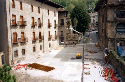 Xabier Maria Munibe plazaren obrak; ezkerraldean Ondartza iturritxo etxea; eskumaldean Mouia Barrena etxea; parean Komenio kalea |