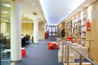Udal Artxiboa atzealdetik hartuta: ezkerraldean lanerako gela, eskumaldean liburutegi osagarria, parean sarrera |