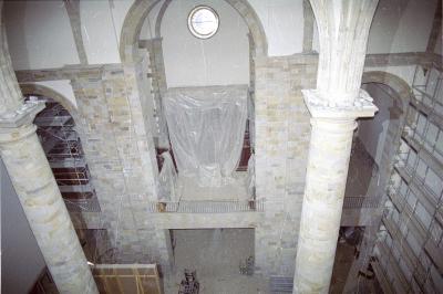 Santa Marina elizaren berrizte lanak: erdiko nabea andamioekin eta korua goitik ikusita |