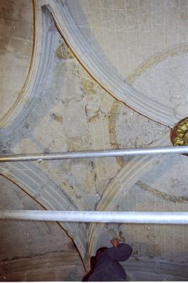 | Santa Marina elizaren berrizte lanak: langilea andamioaren gainean gurutze gangan agertutako pinturekin lanean |