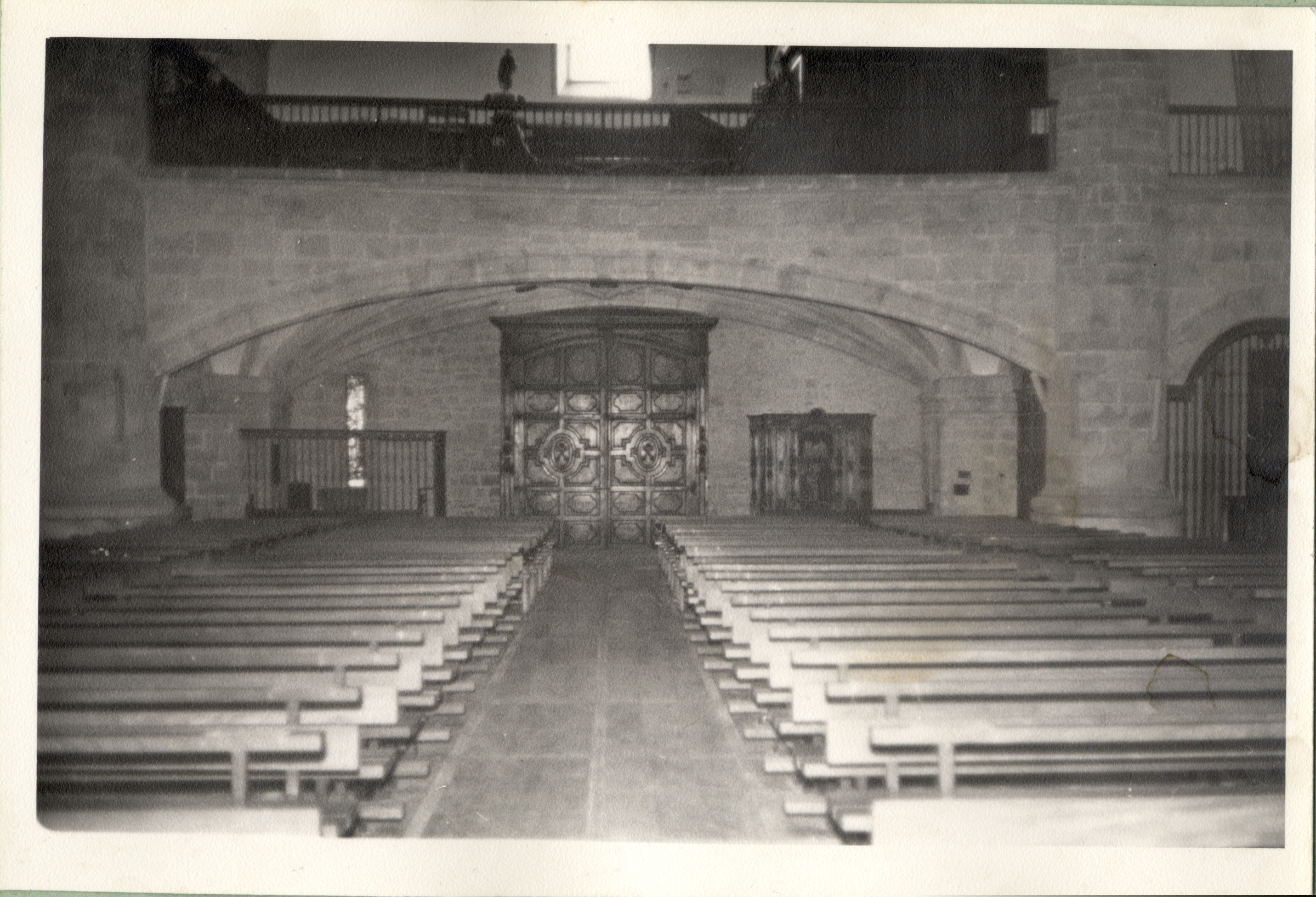 | Altare nagusi azpitik ateratako San Pedroko elizaren bista: korua, aitortegia, San Pedro kalera irteera duen elizako ate nagusia eta eserlekuak. |