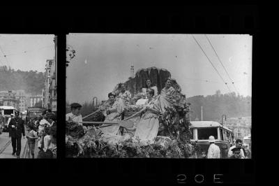 | Kabalgata Donostiako Antia kaletik pasatzen: idiak bultzatutako karroza batean mutikoa arraun batekin eta bost neska; ondoan gordaia munizipala eta atzetik autobusa. |