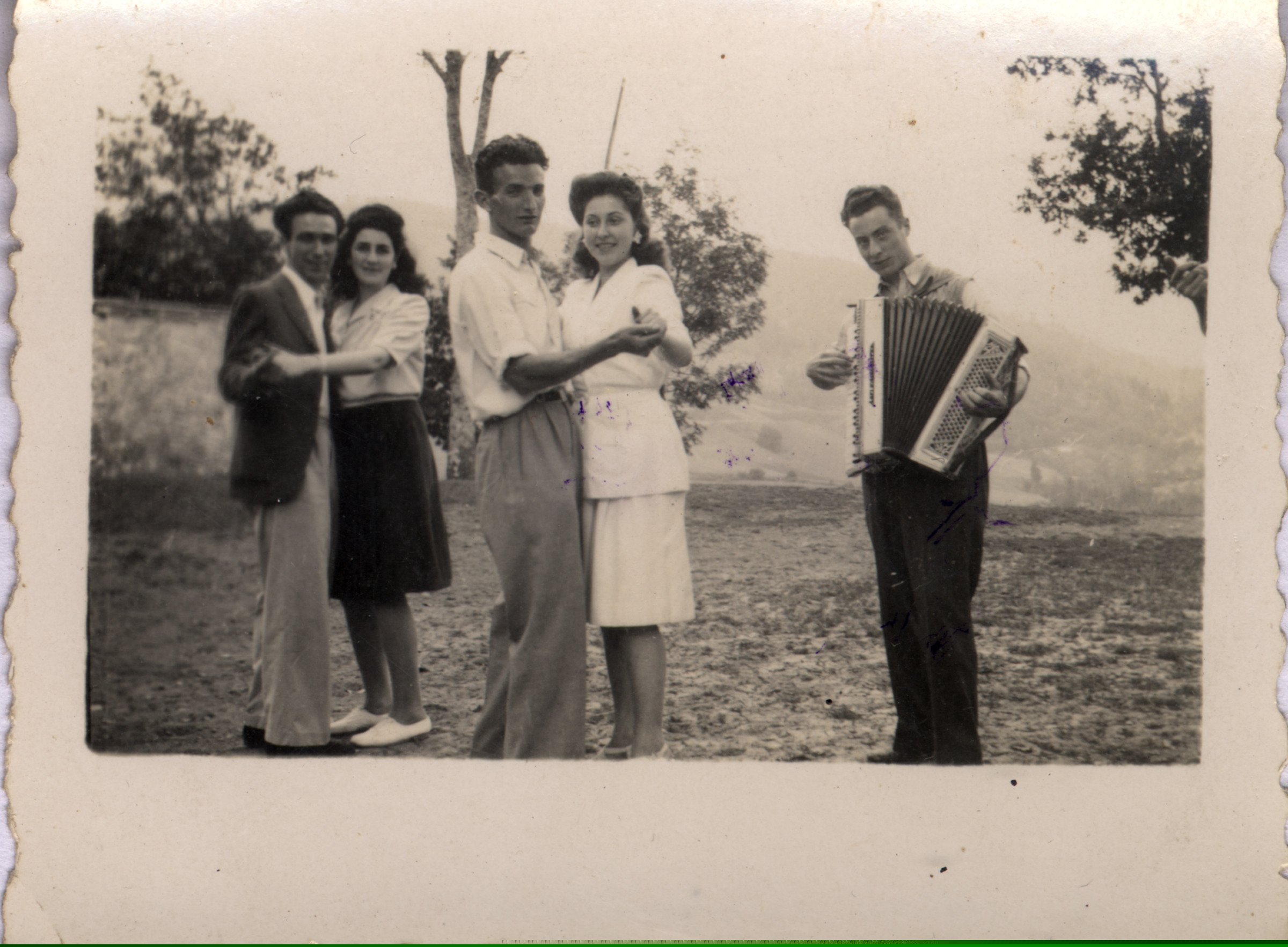 | San Juan egunean Aozaratzako erromerian bi bikote dantzan eta gizonezko bat akordeoia jotzen. |