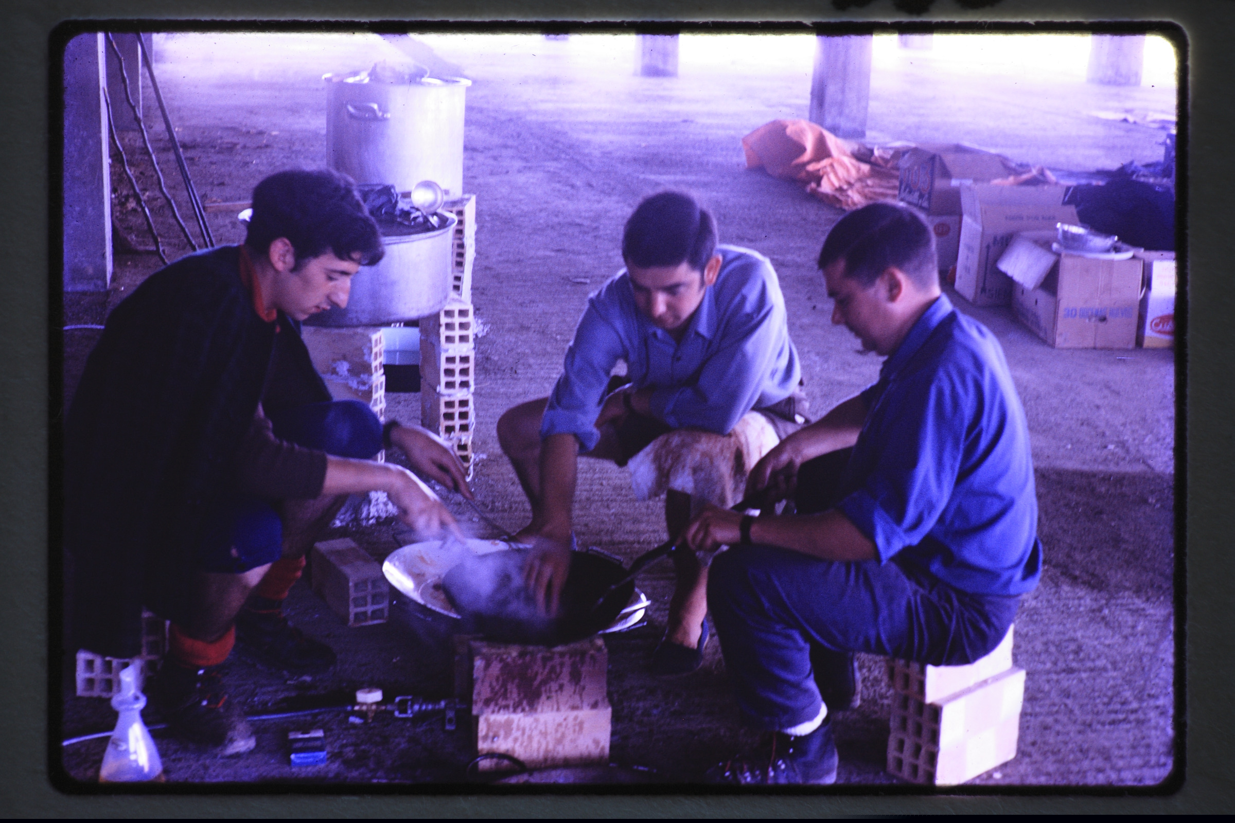 | Pol-Pol-eko gaztetxoen akanpada: Hiru gizon lurrean jarritako su txiki batean janaria prestatzen. Altzasu elkarteako beheko solairuan, oraindik itxi barik zegoenean | 1970 |
