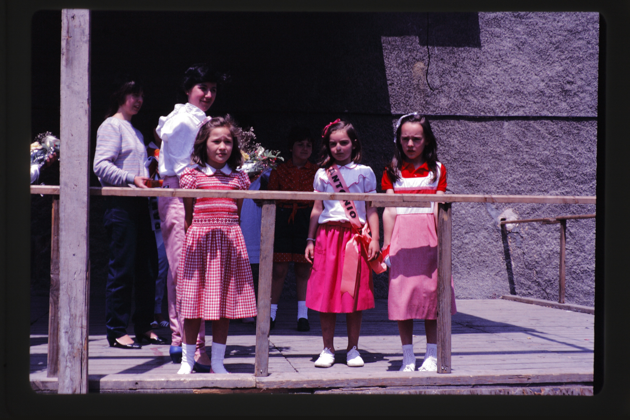 | San Antonioko jaiak: hiru neskatila. Horietako batek, San Antoniko jaietako banda gainean duelarik. |