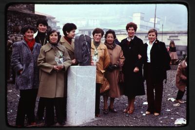 San Antonioko auzokideak, eskulturaren ondoan. Atzean Algodonera lantegia dago. |