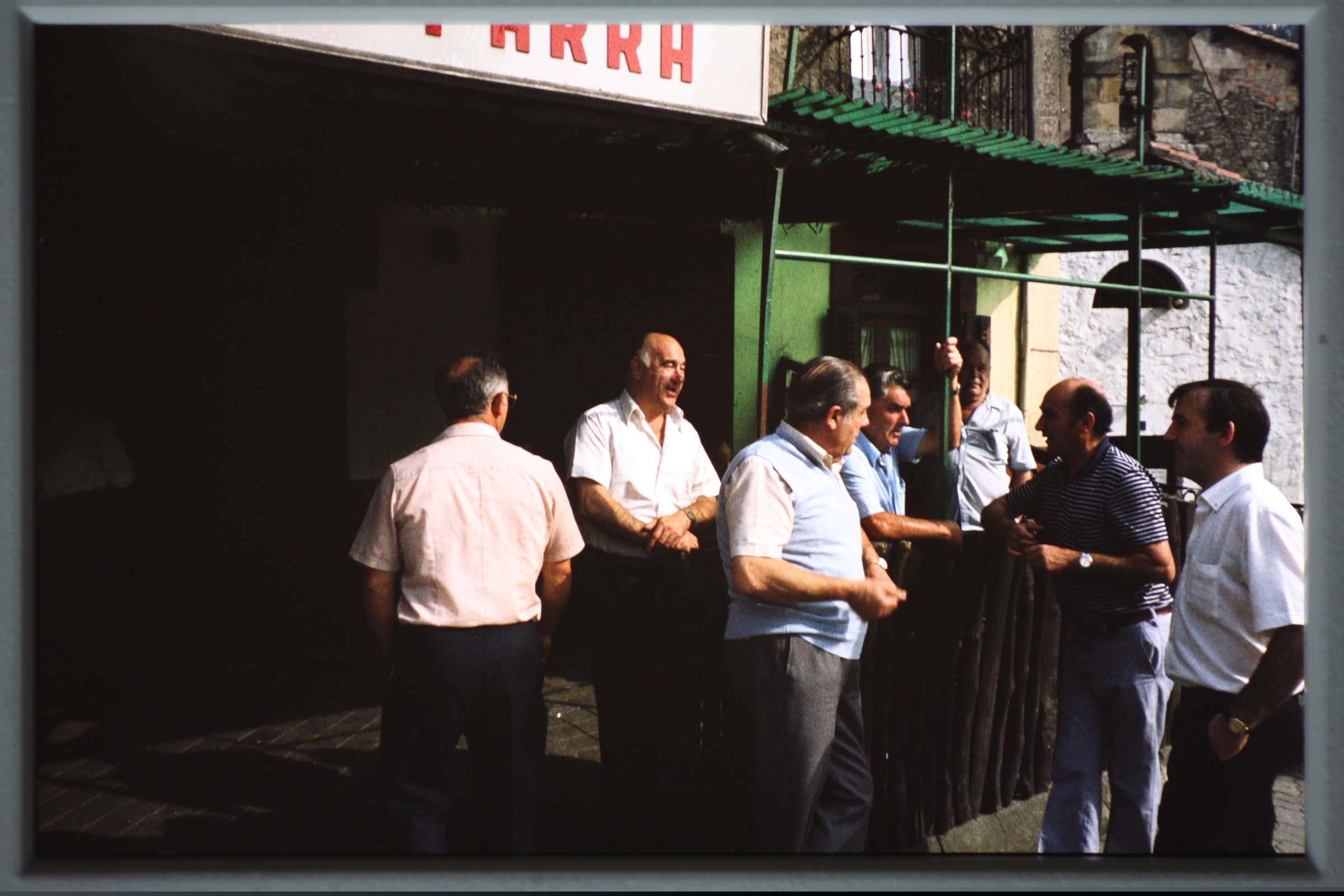 | San Antonioko jaiak: gizonak La Parra tabernaren kanpoan. |