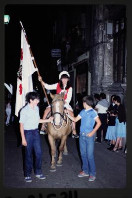 | San Martingo jaiak: elkarteko dama bat, zaldiaren gainean, danborradan. |