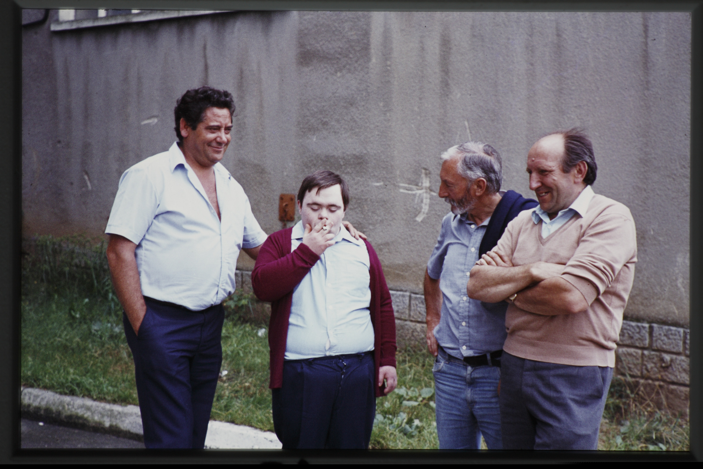 | Gureak-ekoen bilkura probintziala egunekoa: lau gizon eta horietako bat zigarro bat erretzen. |