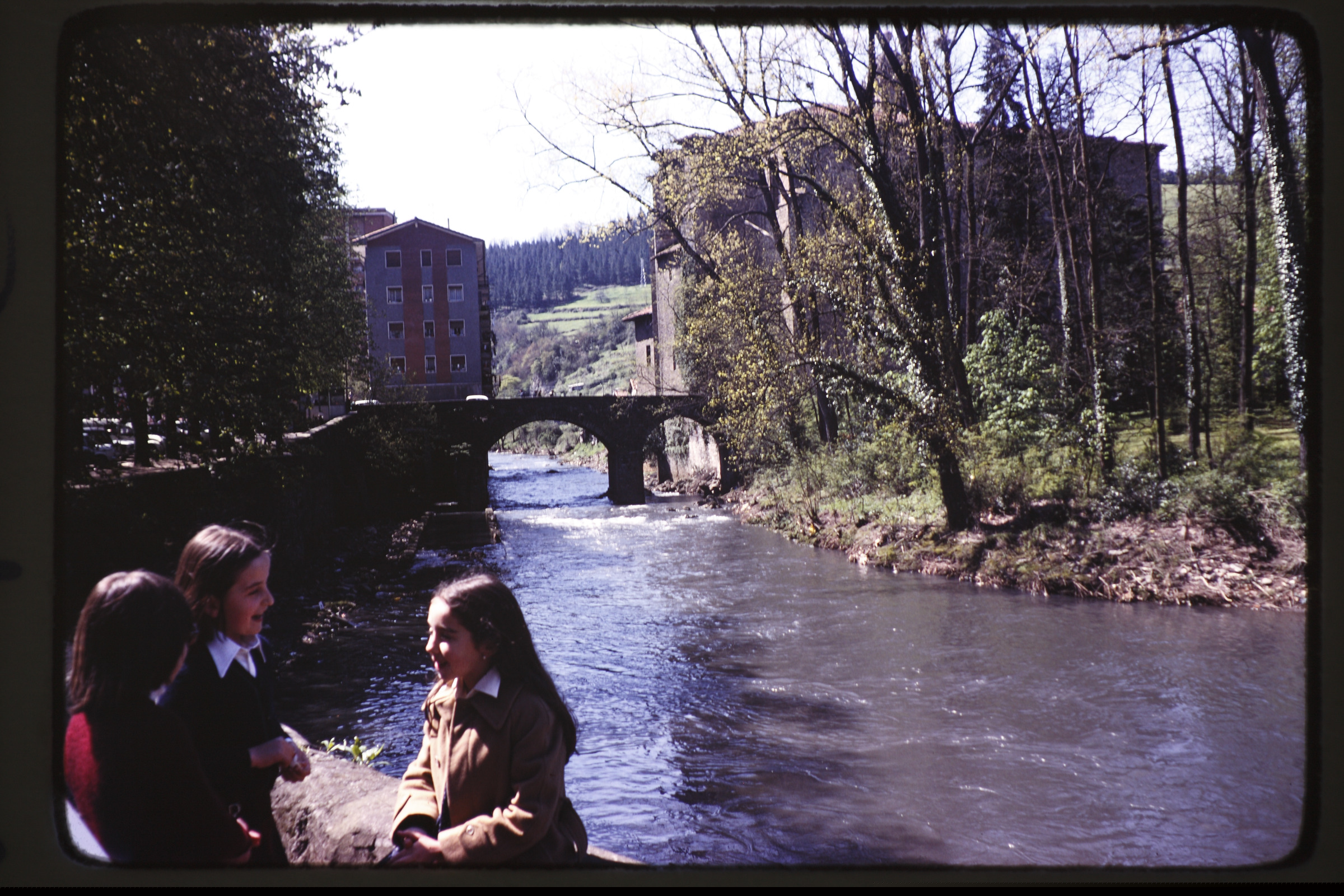 | Deba ibaia, Bideberri pasealekutik ikusita: aurrean hiru neskatila eta atzeko aldean, Santa Marinako zubia. | Bergara |