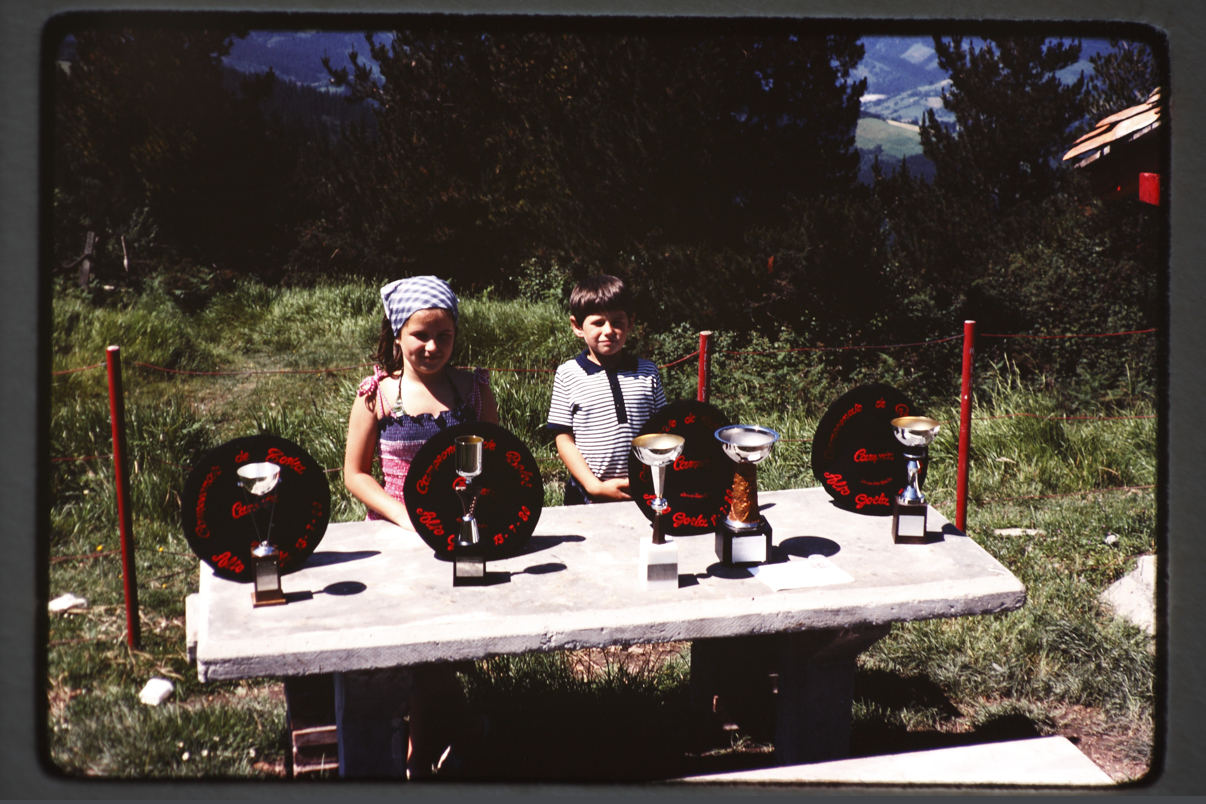 Gorlako bola-jokoaren txapelketa: bi haur txapela eta kopekin. |