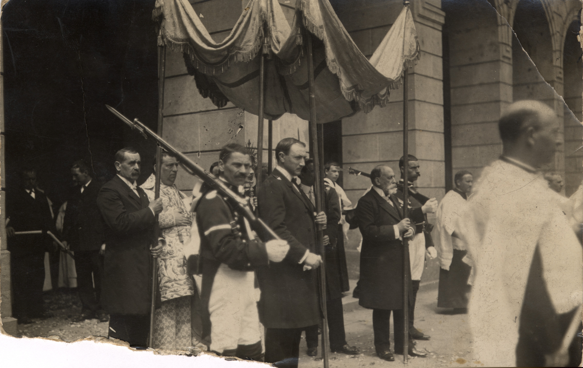 | Prozesioa gizonak eta apaizak; aldamenetan gizonak uniforme eta armekin; atzekaldean Seminarioa. |