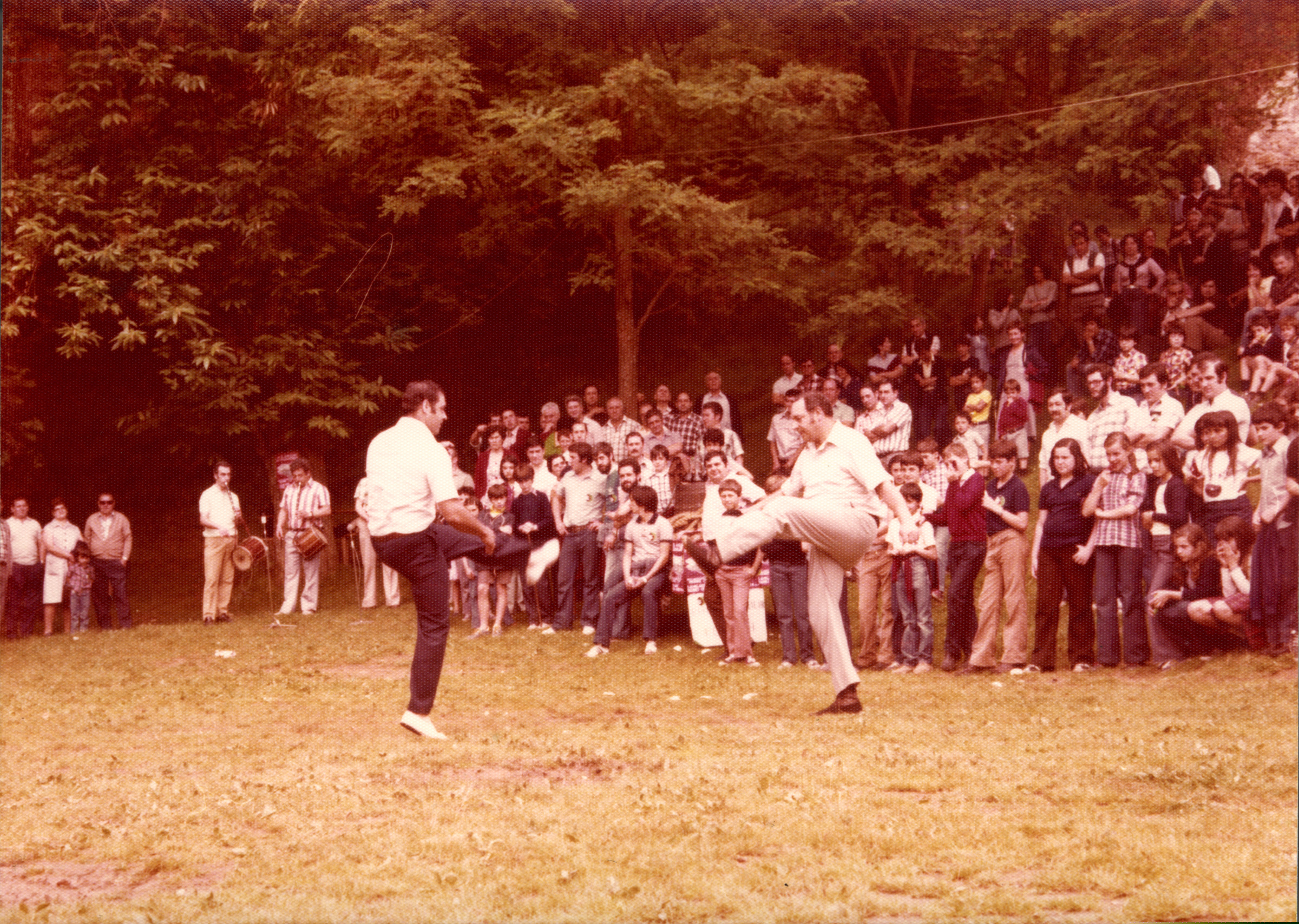 | San Martzialgo kanpan aurreskua dantzatzen. | "Foto Uribe. Bodas - Reportajes - Fotos en color - Blanco y negro. Teléf. 76 26 77 - Vergara - 3 JUL 1977" [imp. v.] |
