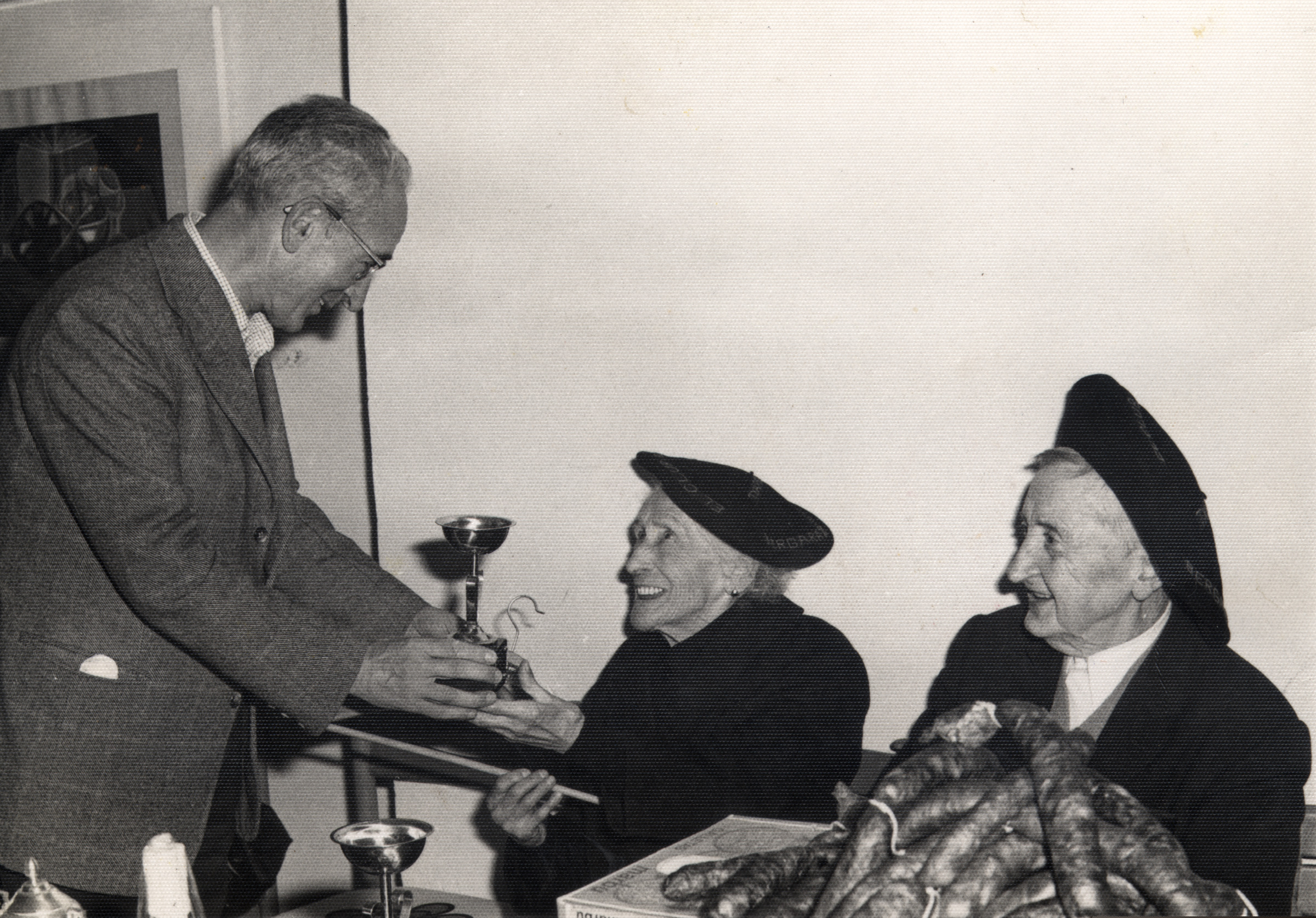 | Sari eta opari banaketa, gizon bat beste emakume eta gizonezko bati kopa ematen. Omenaldia aitonetan "Homenaje a la vejez". | "Foto Uribe Telf. 762677 Vergara 2 ABR 1977" [imp. v.] |