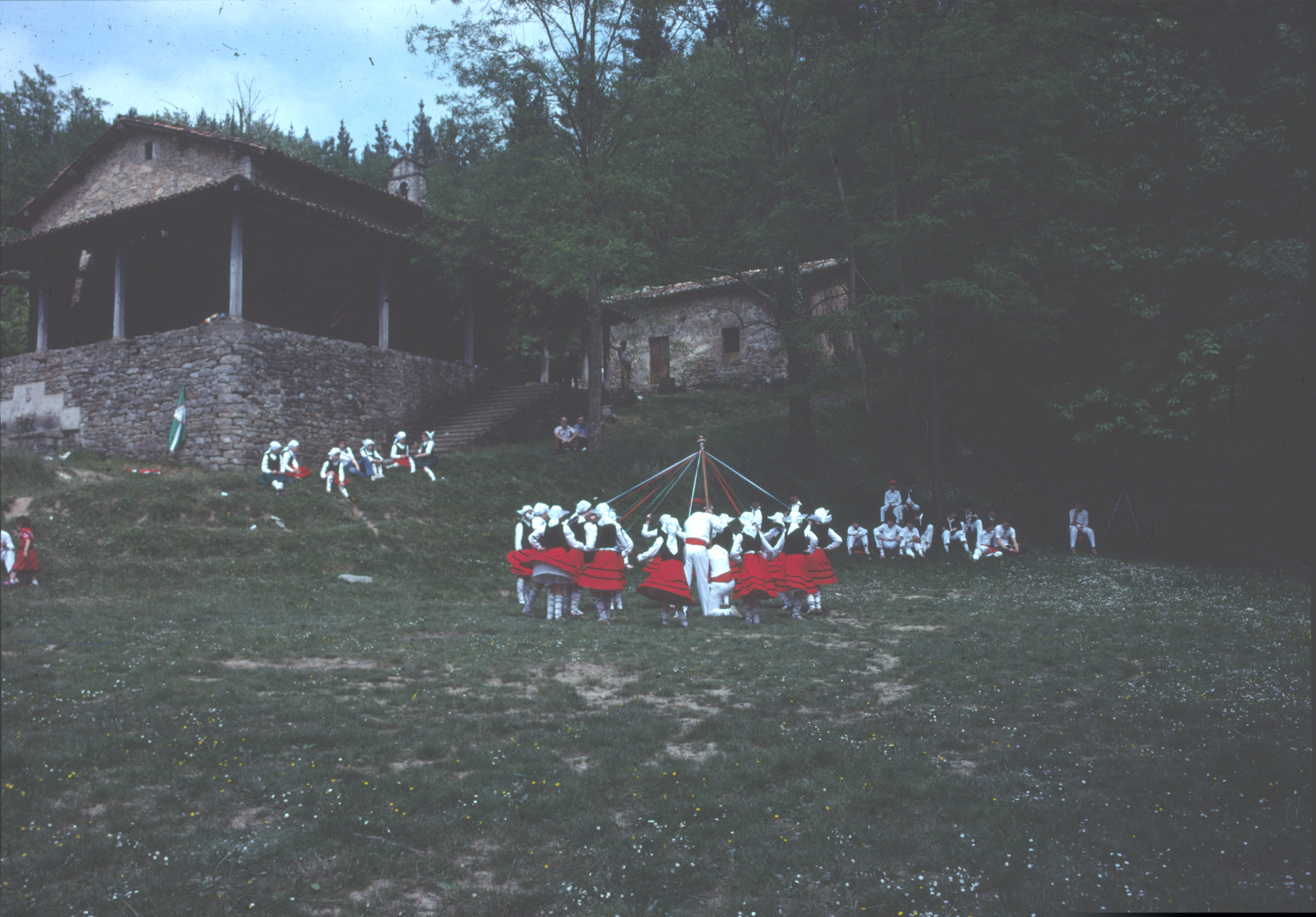 | Aranzadi ikastolako dantzari eta txistulari taldea San Martzialgo ermita aurrean. |